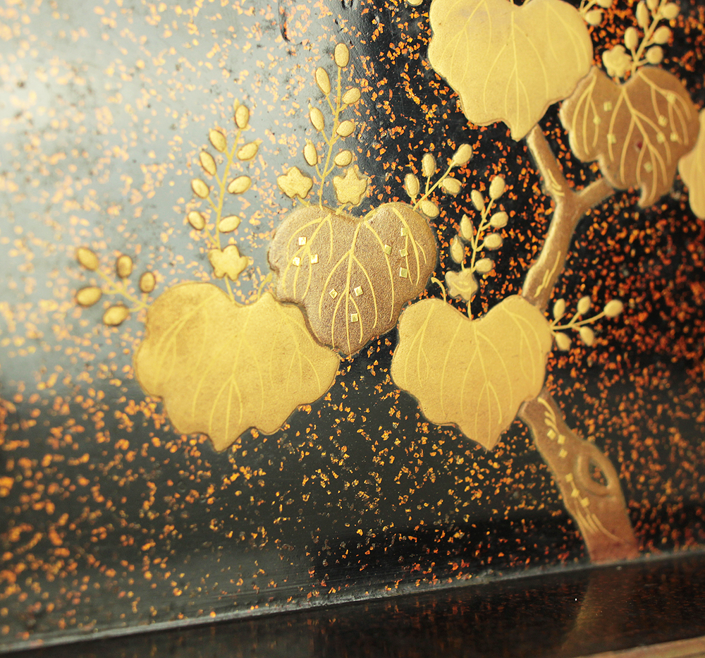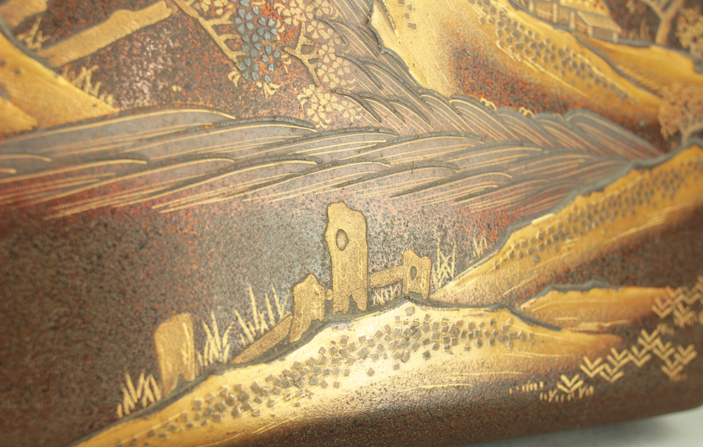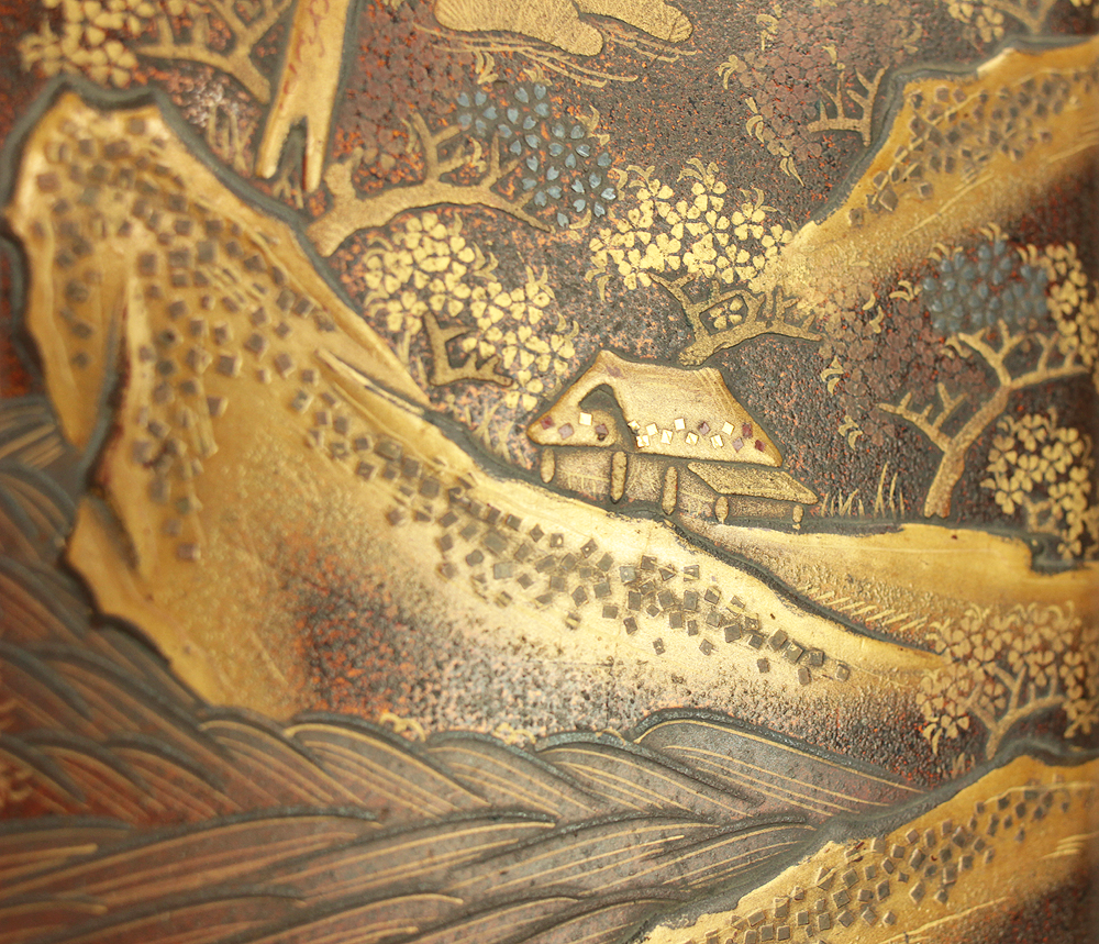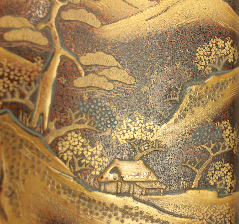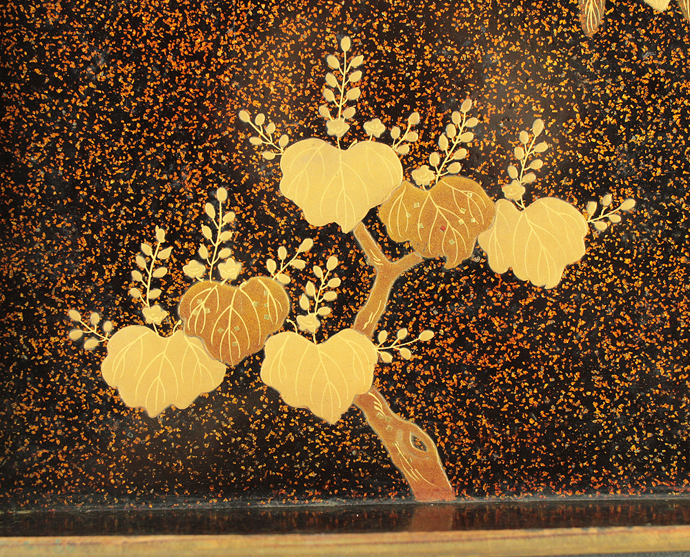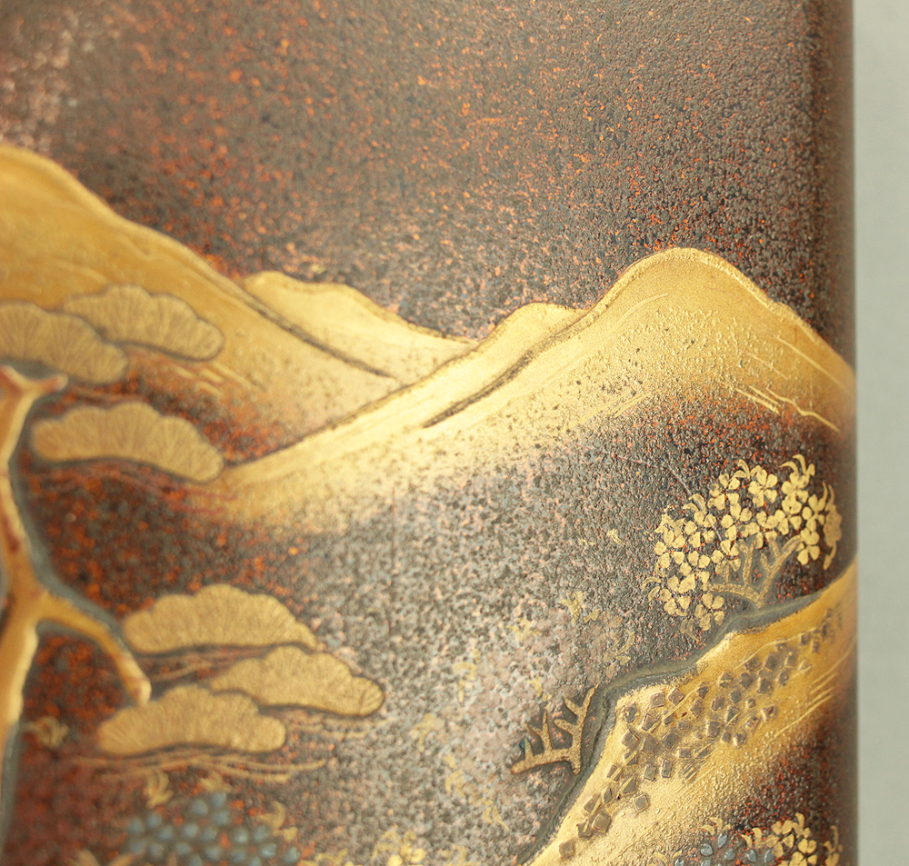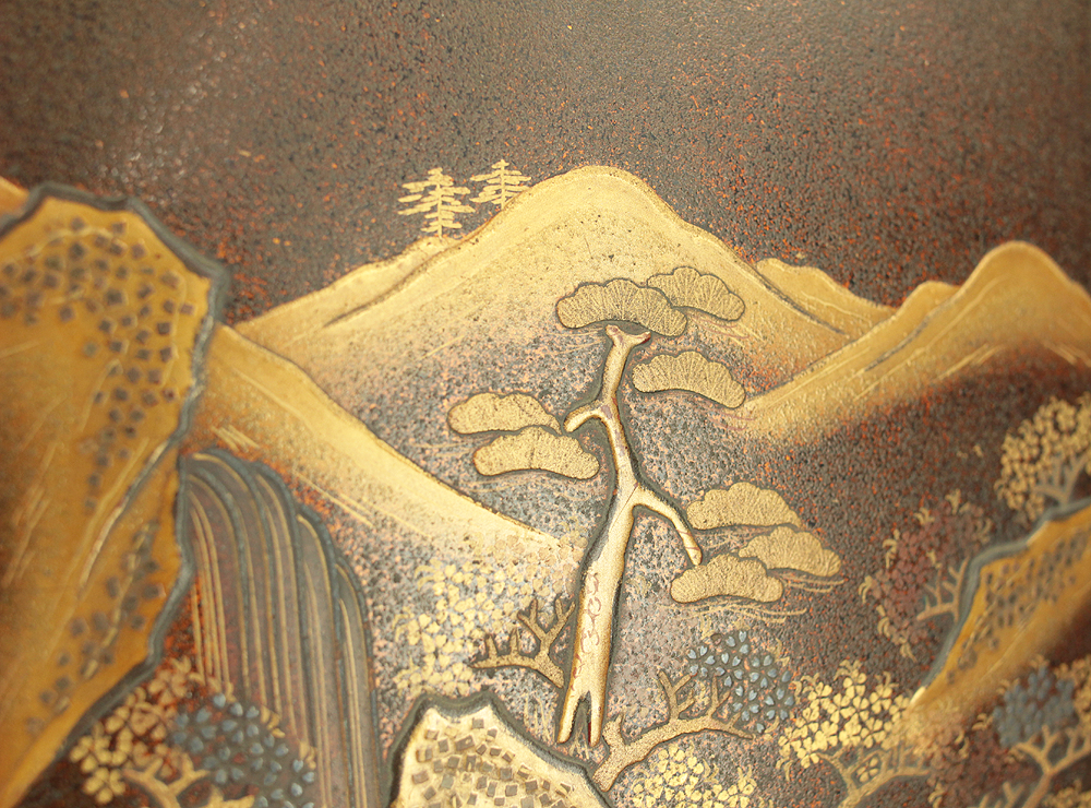 Nashiji Makie is that Nashi-ji powder is sprinkled on the lacquered area, and then further layers of lacquer are applied and polished out.