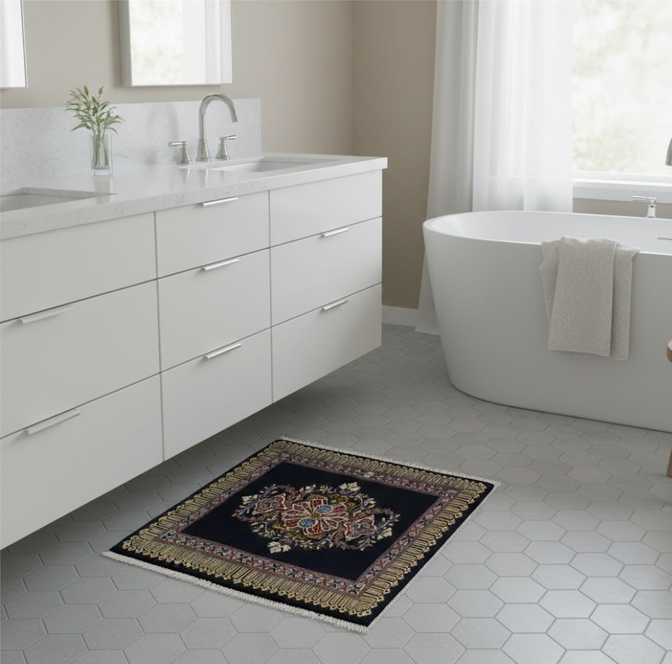 Handmade Vintage Area Rug Purple Navy Floral Design Small Square Carpet 3X3 ft