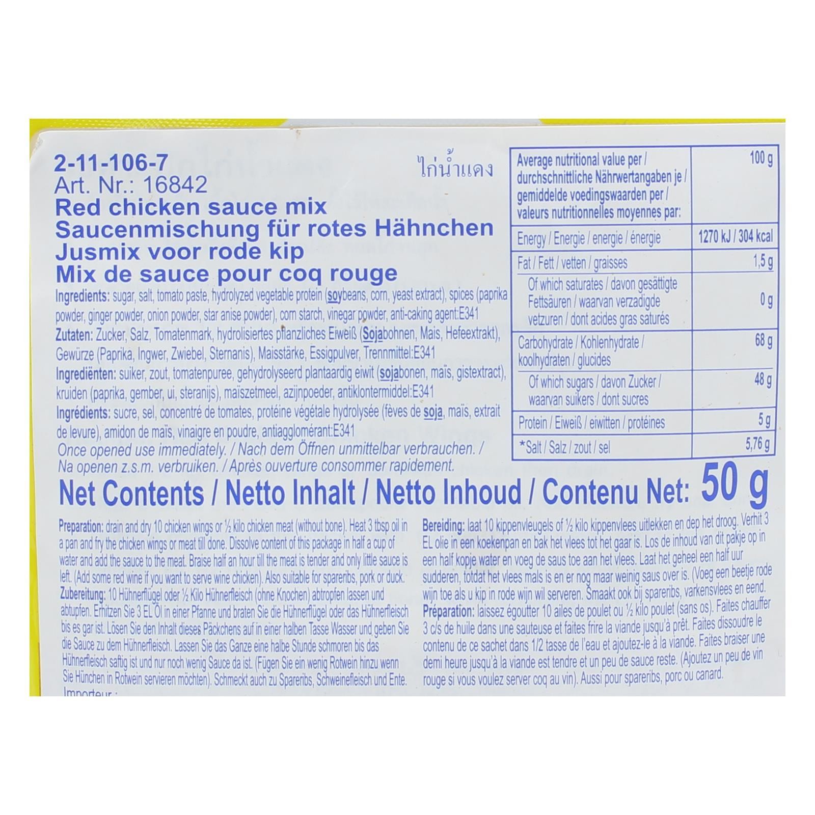 Zucker, Tomatenpulver, hydrolysiertes pflanzliches Eiweis (hydrolysiertes pflanzliches Eiweis (Sojabohnen, Mais, Weizen, Xylose, Sonneblumenöl, Glukosesirup, Farbstoff E150d, Maltodextrin, Salz, Hefeextrakt, Säureregulator E330, Maissträrke, Gewürze (Paprika, Ingwer, Zwiebel, Sternanis), Salz, Essigpulver, Trennmittel E551 (nano), Säureregulator E296