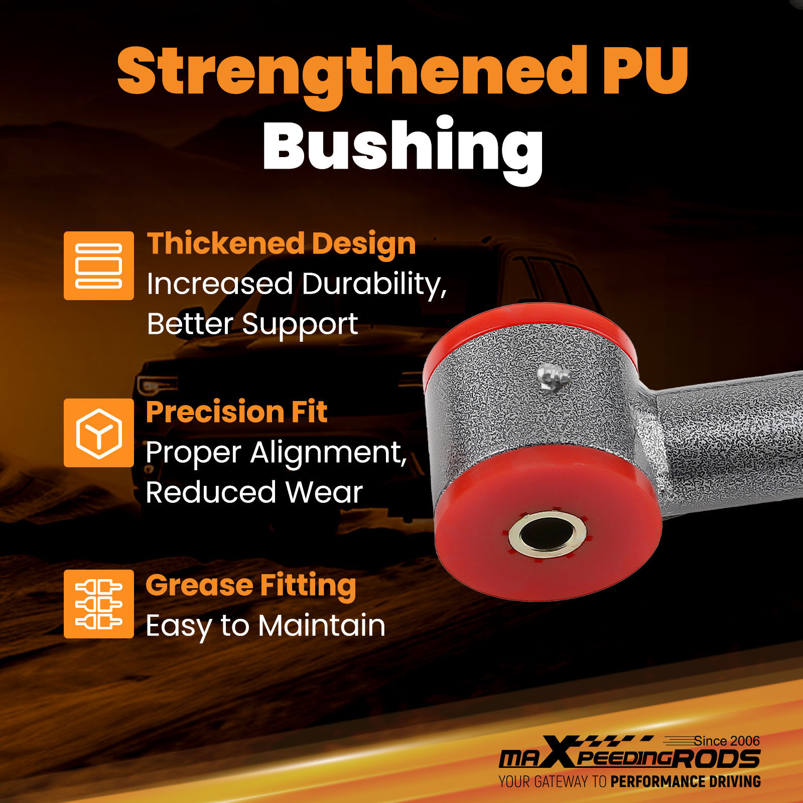 - Polyurethane bushings strengthen the connection points in automotive suspension components, reduce the slope, and thus increase the responsiveness and feel of the car to the road