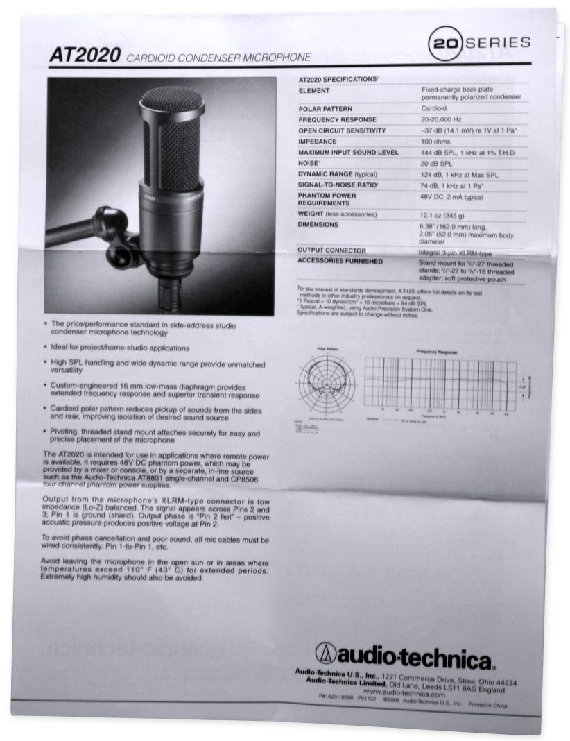 Audio-Technica’s stringent quality and consistency standards set the AT2020 apart from other mics in its class. Its low-mass diaphragm is custom-engineered for extended frequency response and superior transient response. With rugged construction for durable performance, the microphone offers a wide dynamic range and handles high SPLs with ease. The AT2020: the new standard for affordable side-address studio condensers