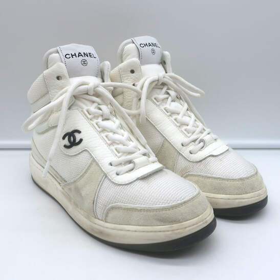 These pre-owned sneakers pair breathable white mesh with luxe ecru suede overlays and a sturdy rubber sole, showing the careful paneling and stitching that make Chanel's 22P line a favorite among fashion editors and collectors for its refined take on sport-luxe footwear.