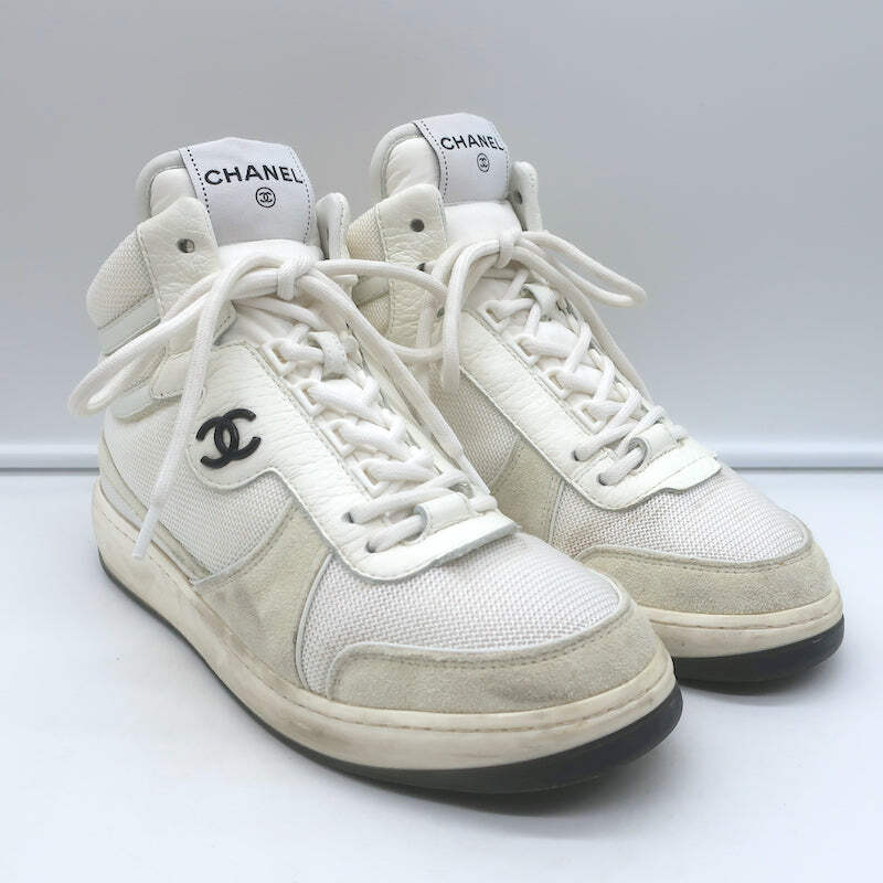 Chanel 22P high-top sneakers in white mesh and ecru suede bring a relaxed, couture-infuséd athletic look to your wardrobe in European size 38 (fits like a US 7.5).