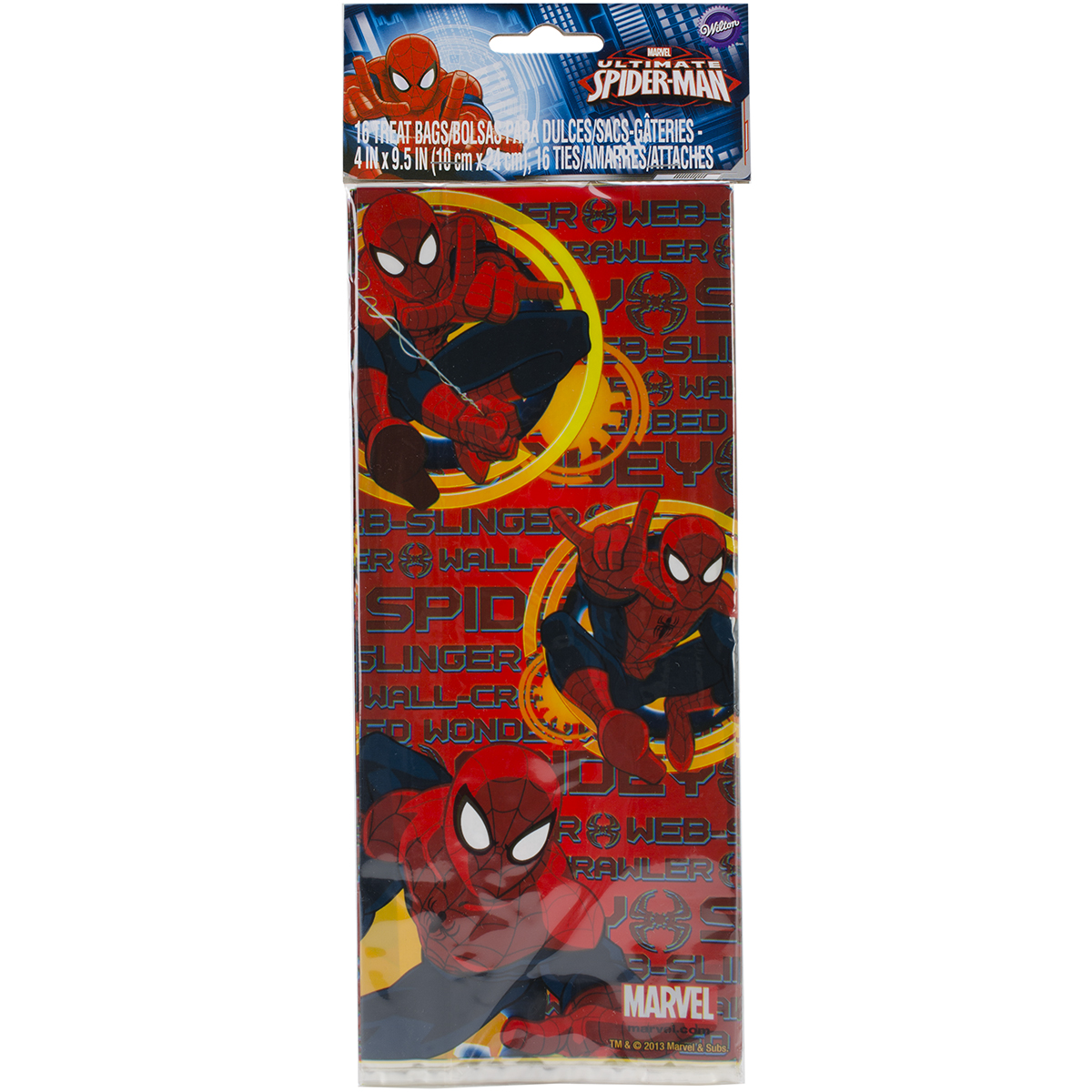 WILTON-Treat Bags. Pack up all of your favorite snacks to give out as a gift or party favor! This package contains sixteen 4x9-1/2 inch plastic treat bags and sixteen plastic ties. Design: Spider-Man. Imported.