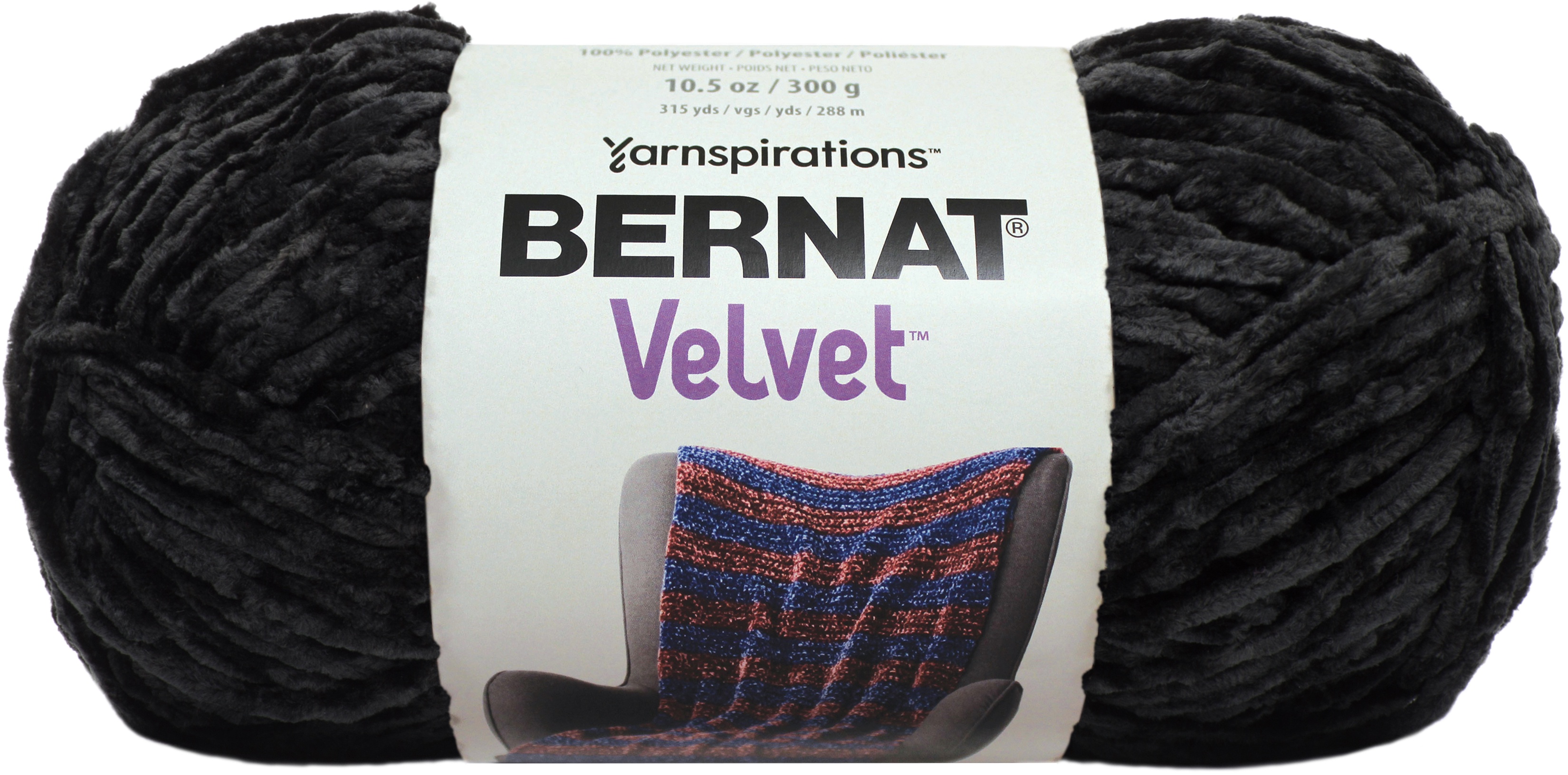 Bernat-Velvet. Bernat Velvet is an eye-catching yarn that works up into lush, velvety knit and crochet projects. Featuring a beautiful shine and classic shade range, Velvet is a soft choice for blanket and pillow projects for your home. Weight category: 5. Content: 100% Polyester. Putup: 10.5oz/300g, 315yd/288m. Gauge: 12 stsx17r = 4in/10cm on size US10.5/6.5 mm knitting needles. Crochet Tension: 10scx11r on USK/6.5 mm crochet hook. Dyelotted: We try but are not always able to match dyelots. Care: Hand wash, dry flat. Comes in a variety of colors. Each sold separately. Imported.