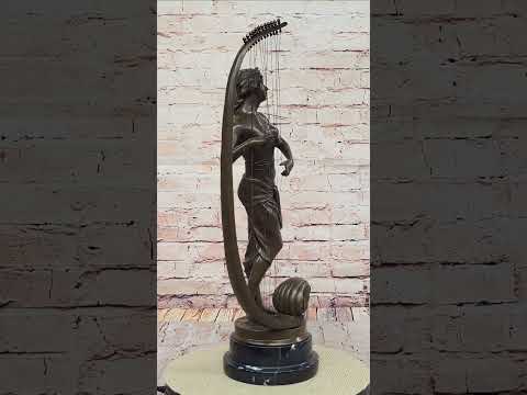 Handcrafted using the lost wax method, this sculpture showcases exceptional detail and craftsmanship, bringing to life the intricate textures of her attire, the finely tuned harp, and the serene expression on her face. The rich brown patina finish enhances the depth and character of the piece, highlighting the contours and shadows that give the figure a lifelike presence.