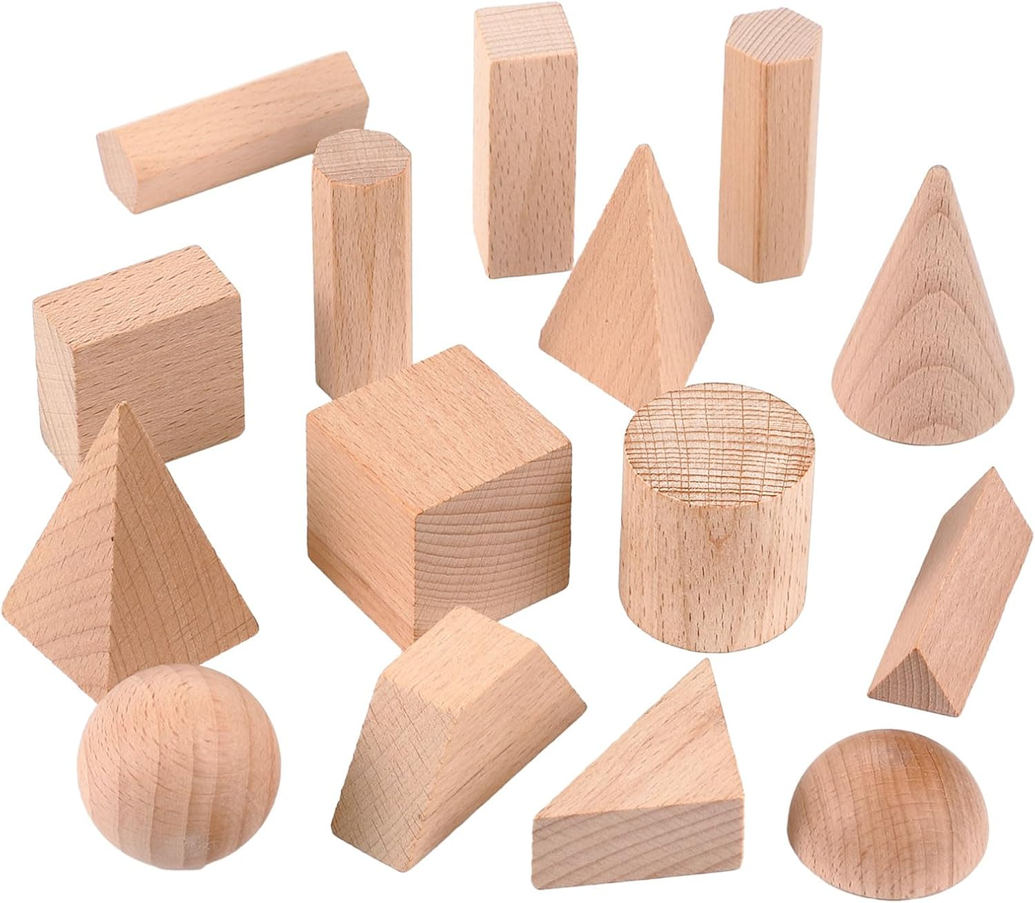 15 Pcs 3D Shapes Geometric Solids Wooden Shapes Large Size Burlywood Color Geometric Shapes Blocks Set Montessori Learning Toy Pattern Blocks Solid for Preschool Elementary Home School Supplies