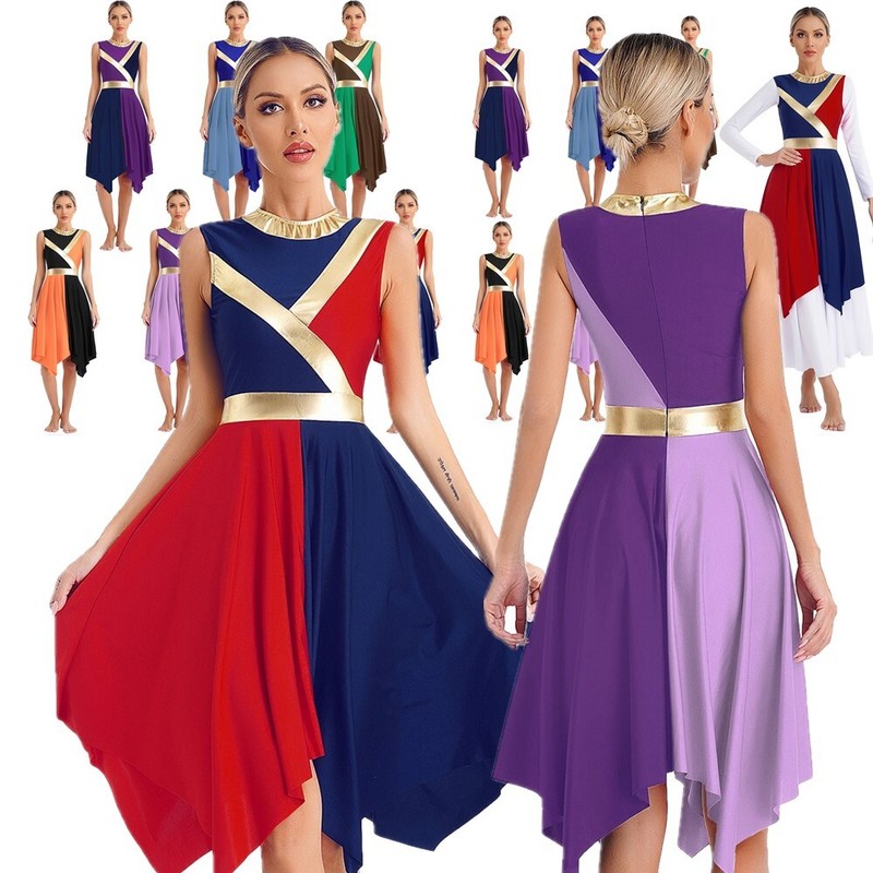 Sleeveless liturgical dance dress for women, color block patchwork design, classic round neck, simple but stylish.