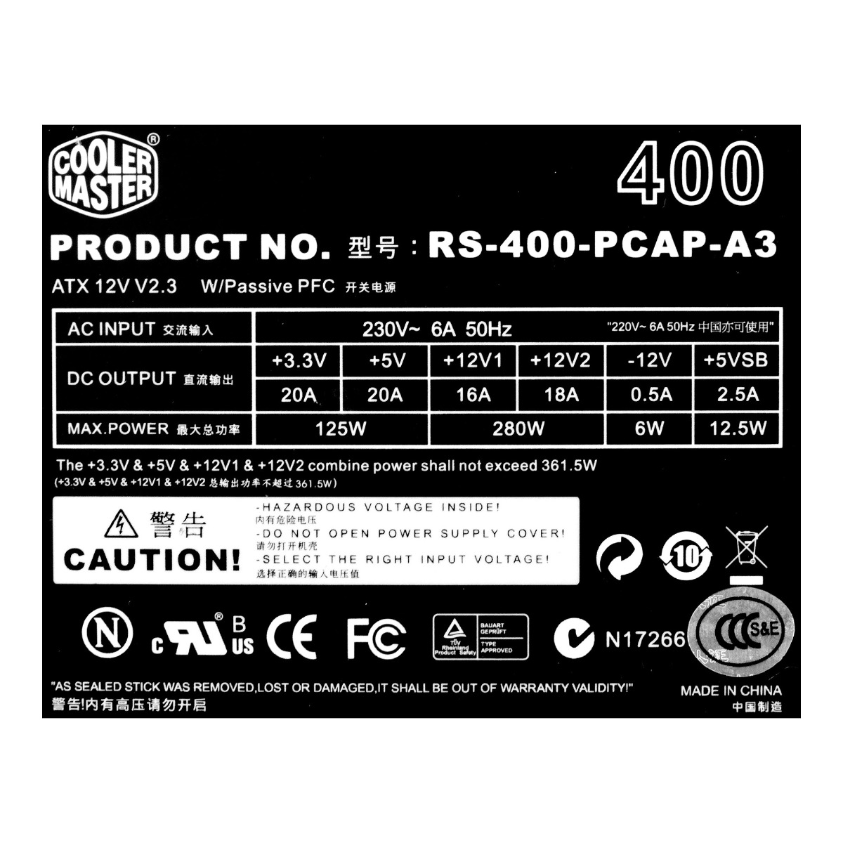 COOLER MASTER RS-400-PCAP-A3 400W ATX 20+4-PIN SATA MOLEX FDD ATX12V PCIe