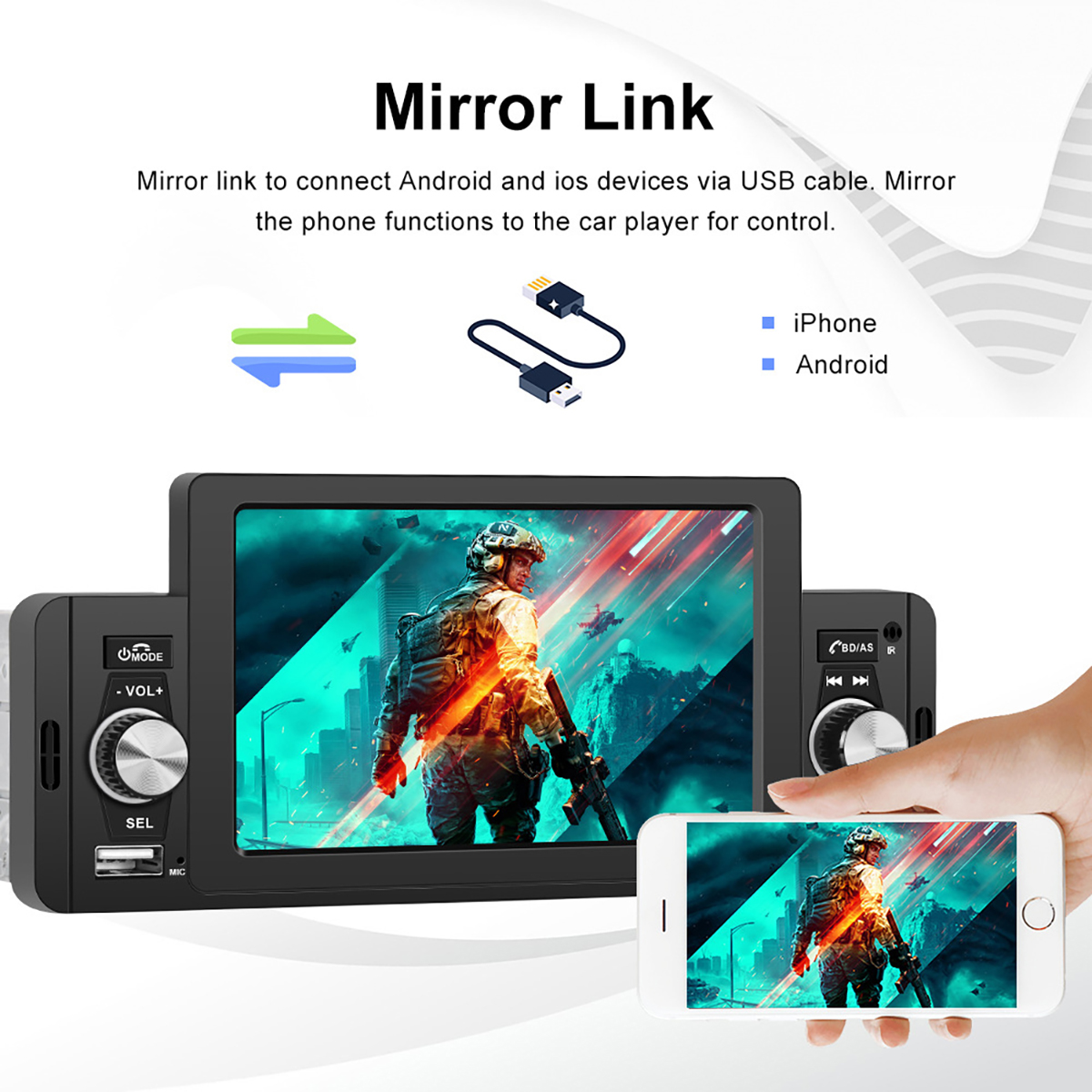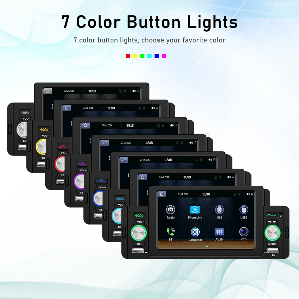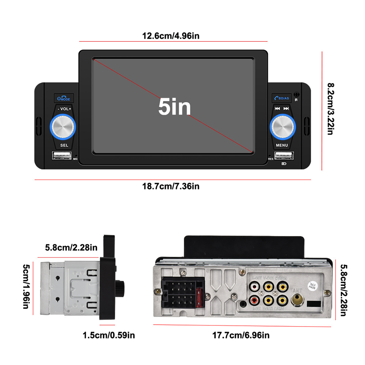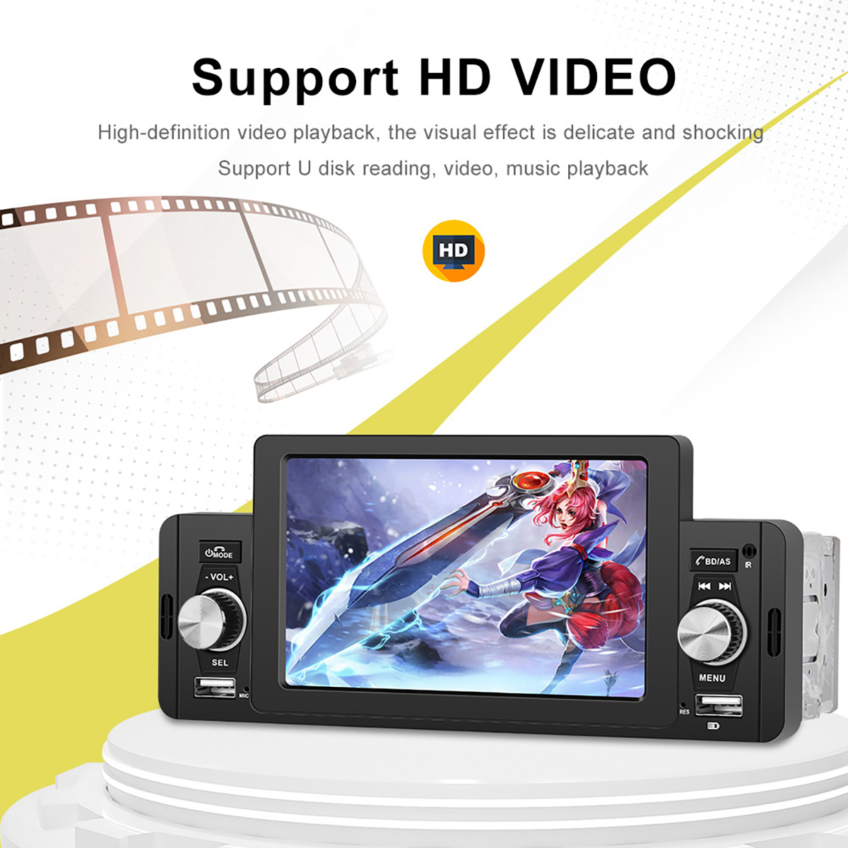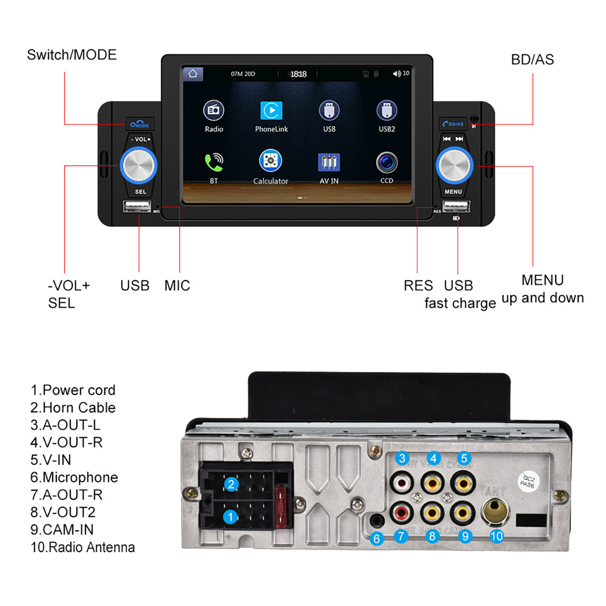 6. Media: support various brands of unlimited capacity USB flash disk/USB card reader/audio and video input (AUX IN)/audio output (subwoofer)/video output (same screen display);