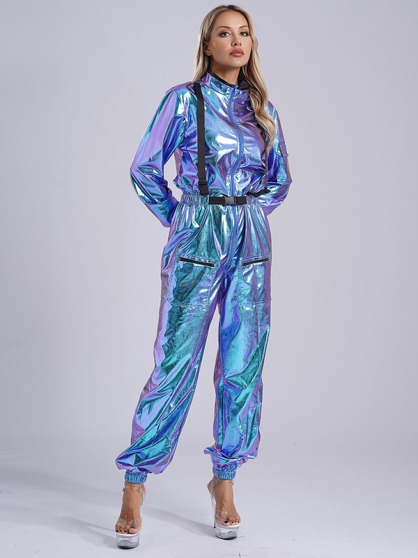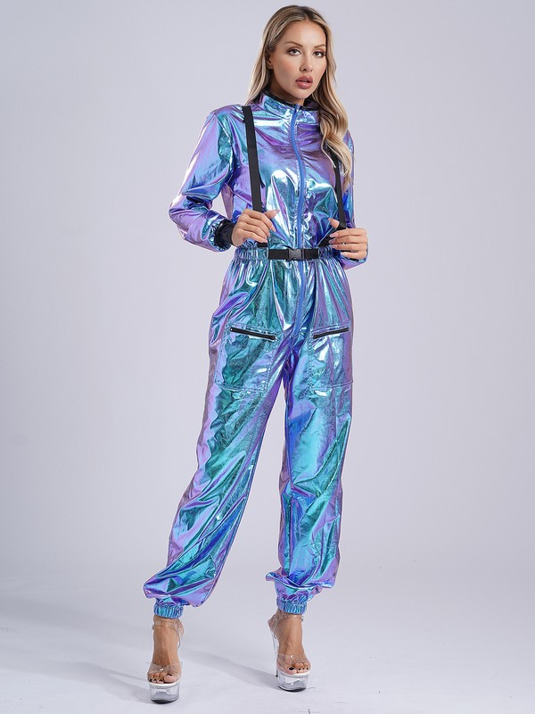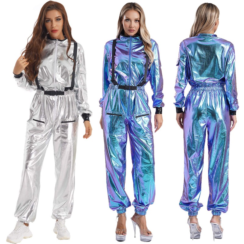 DE iEFiEL Astronaut Kostüm Damen Spacegirl Metallic Glänzend Langarm Jumpsui