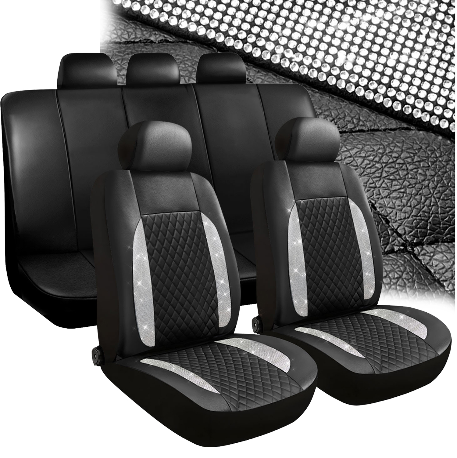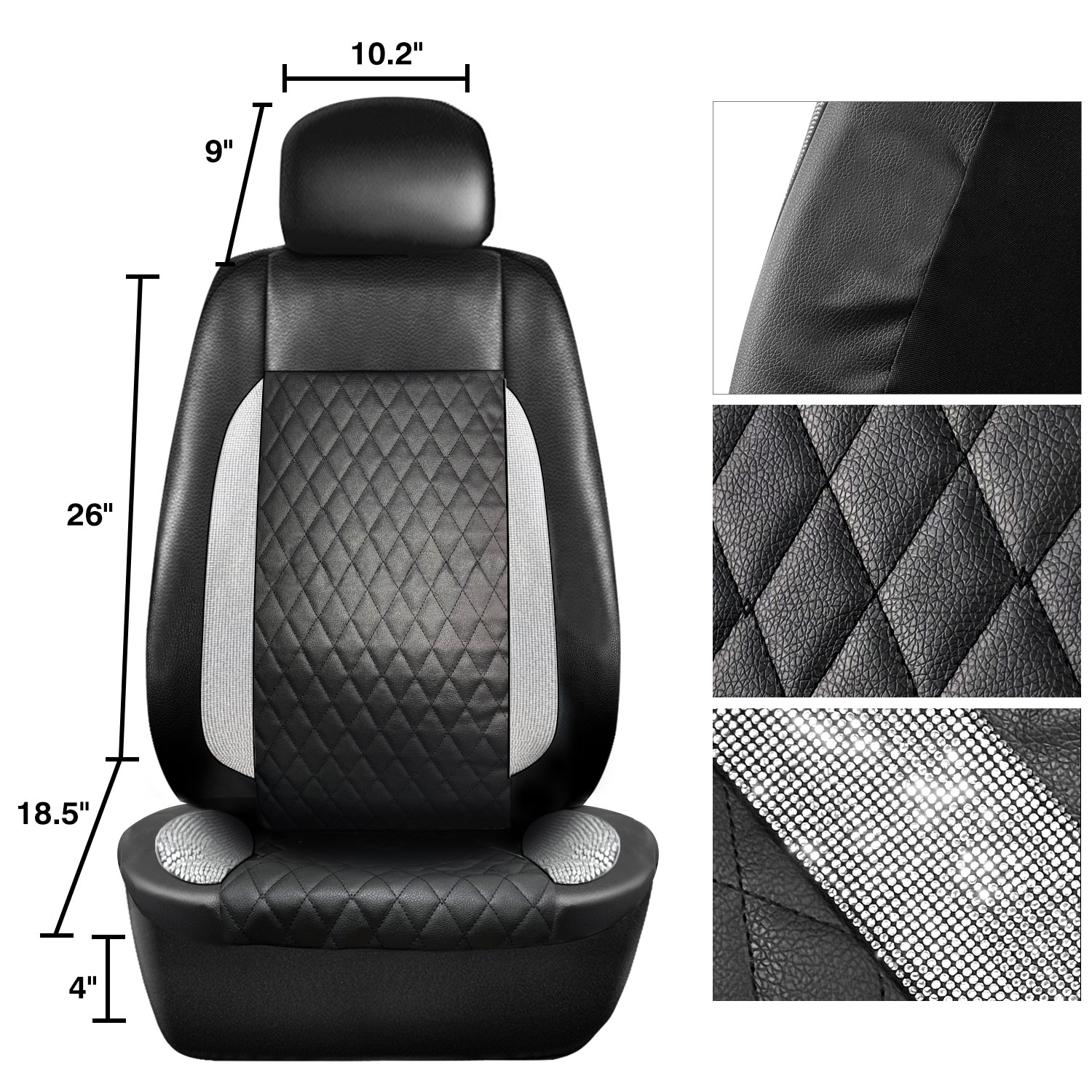 - BLING CAR SEAT COVERS: Premium Breathe Leather with pretty rhinestones Made. Black leather with shiny rhinestones, perfect for women, girls. Perfectly match your interior look. Ensure your seat covers will last for many years to come. Refresh your interior look. Beautiful design with good quality.