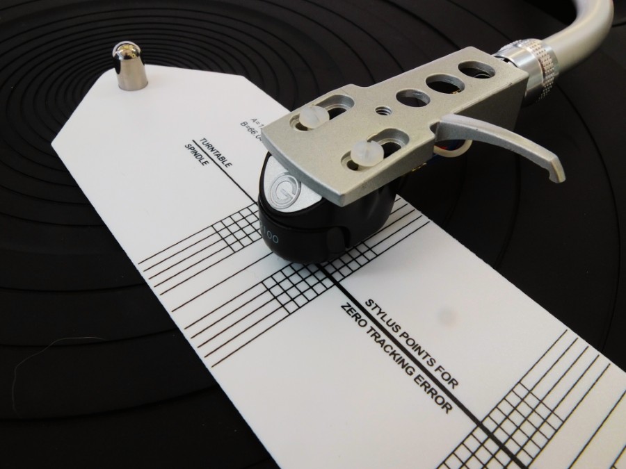 An alignment protractor is used to find the correct distance from stylus tip to tonearm pivot.