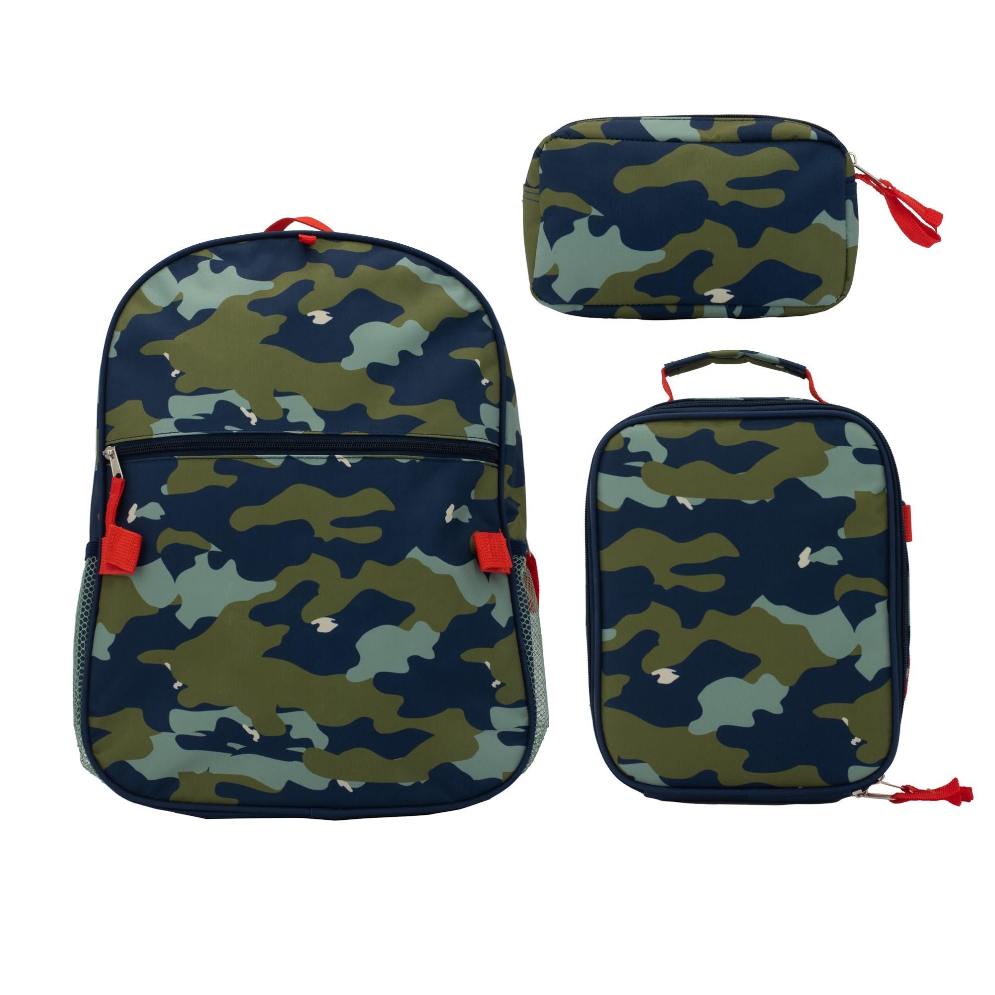 With the Accessory Innovations 3-Piece Backpack Set With 16" Laptop Pocket, you can keep everything you need on your back. The backpack offers padded straps and a specialty sleeve for your laptop, and the lunch kit is insulated to help your meal stay chilled. Sleeve to hold a laptop up to 16". Made of polyester to handle everyday use. Features a main compartment, a front zip pocket, 2 side mesh nylon pockets and a locker loop top handle. Printed ID tag for simple reference. Padded back and adjustable, padded straps with web reinforcement to help keep you comfortable during your travels. Detachable lunch kit offers foam insulation and PEVA waterproof lining to keep food and drinks cold. A padded handle makes carrying simple. Comes with a gadget case for accessories. Stylish camo pattern helps you stand out.
