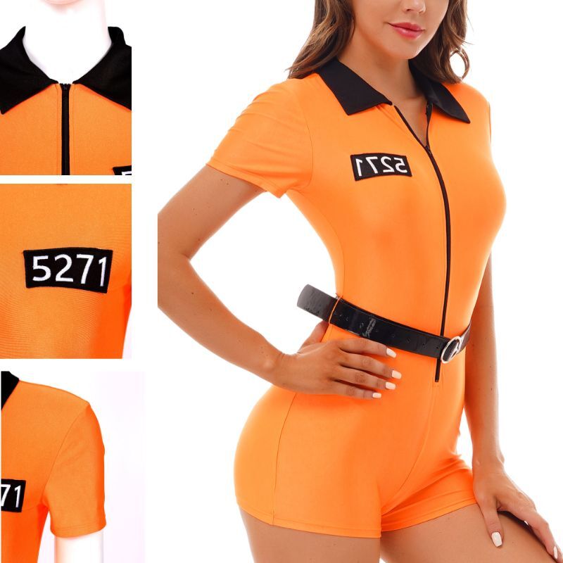 Gefangenes Rollenspiel-Kostüm für Damen, Halloween-Outfit, Reißverschluss, Kurzarm-Overall mit Gürtel.