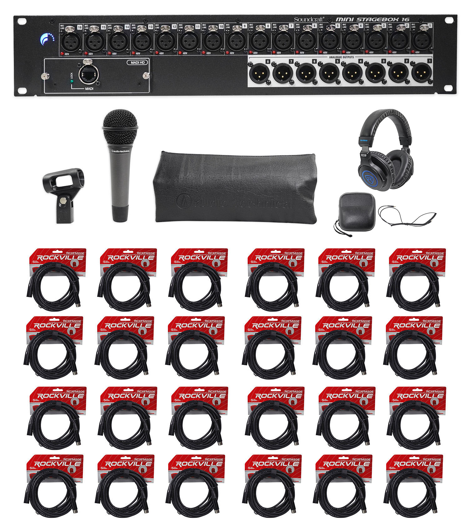 Package: Soundcraft Mini Stagebox 16R 2U Rackmount MSB16R 16x8 Analogue 16-Input 8-Output + (24) Rockville RCXFM20E-B 20 Foot Female to Male XLR Mic Cable Black 100% Copper + Audio Technica ATM410 cardioid dynamic microphone built with HI-Energy neodymium magnet for improved output + Rockville DJ1500 DJ Headphones with Detachable Coil Cable, Case, and Extra Ear Pads