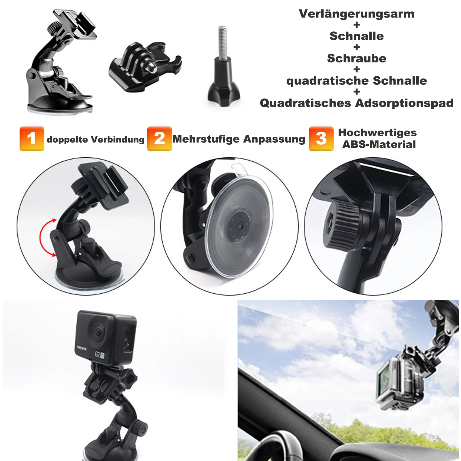 Die große und stoßfeste Tragetasche schützt Ihr Gerät sicher vor Schäden während Ihrer Reise und bei Extremsportarten; Abnehmbarer dreieckiger Saugnapf mit CNC-bearbeitetem Aluminium-Adapterpad und Kunststoffschraube funktioniert mit GoPro für Aufnahmen aus niedrigem Winkel, starke und feste Saugkraft, um die Vibration zu reduzieren.