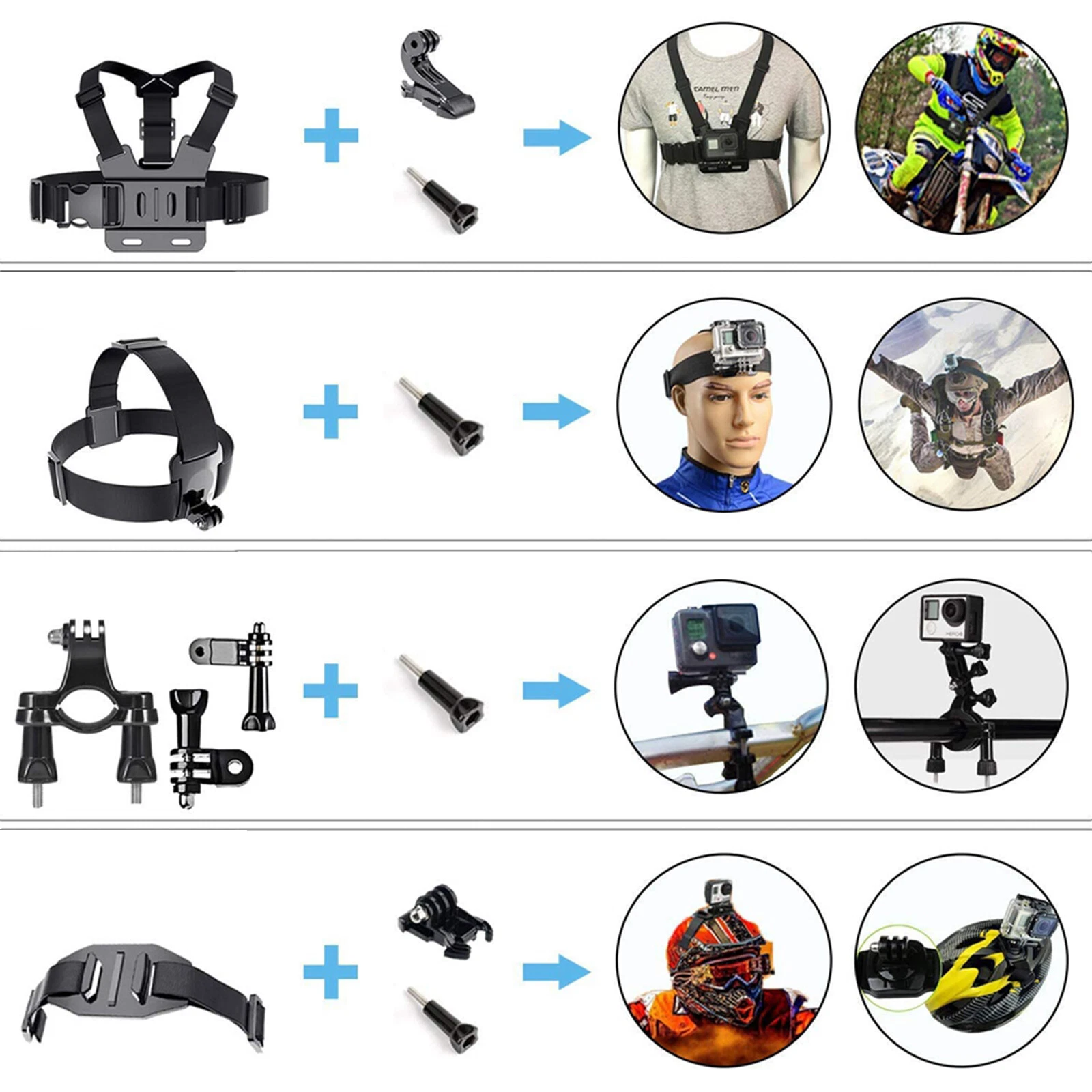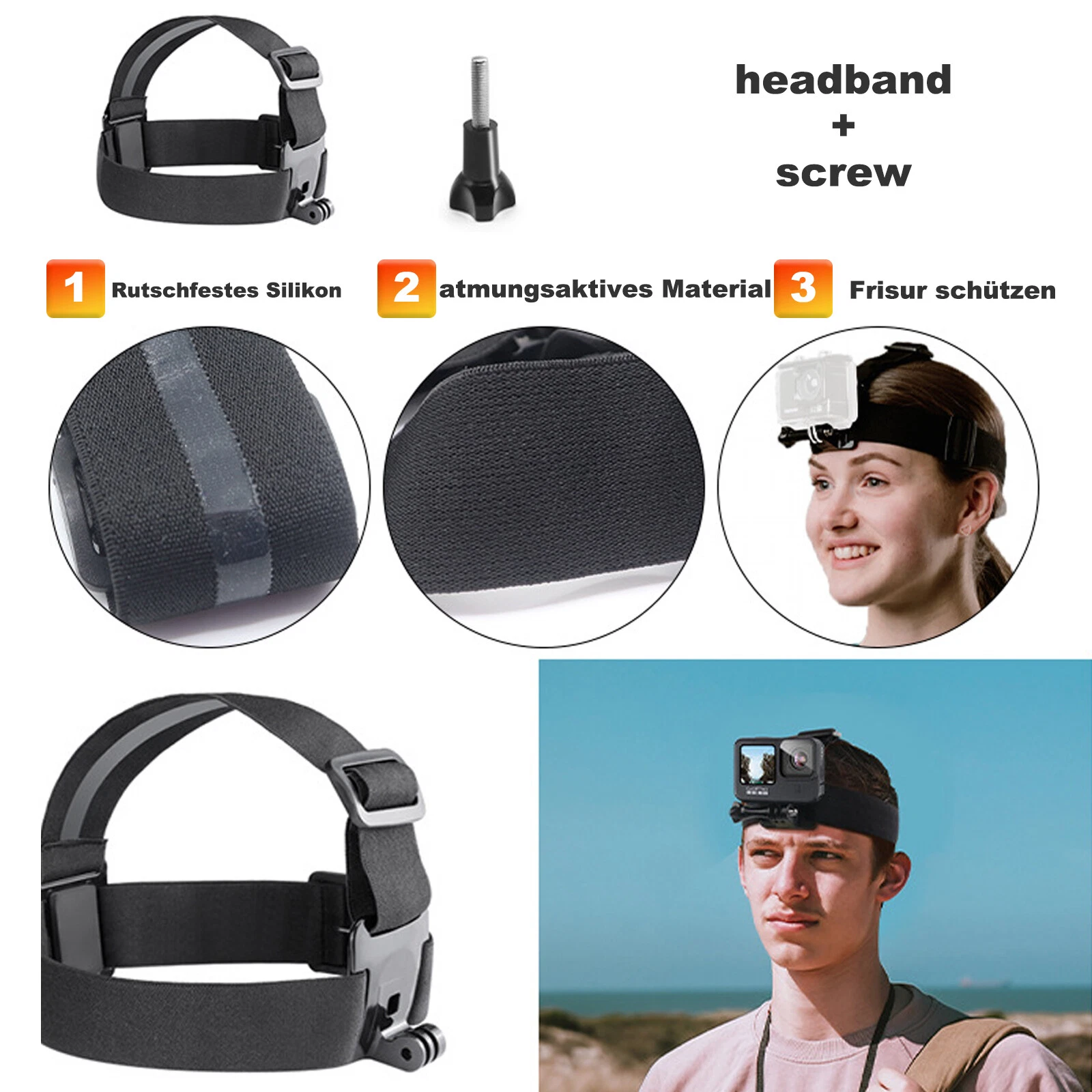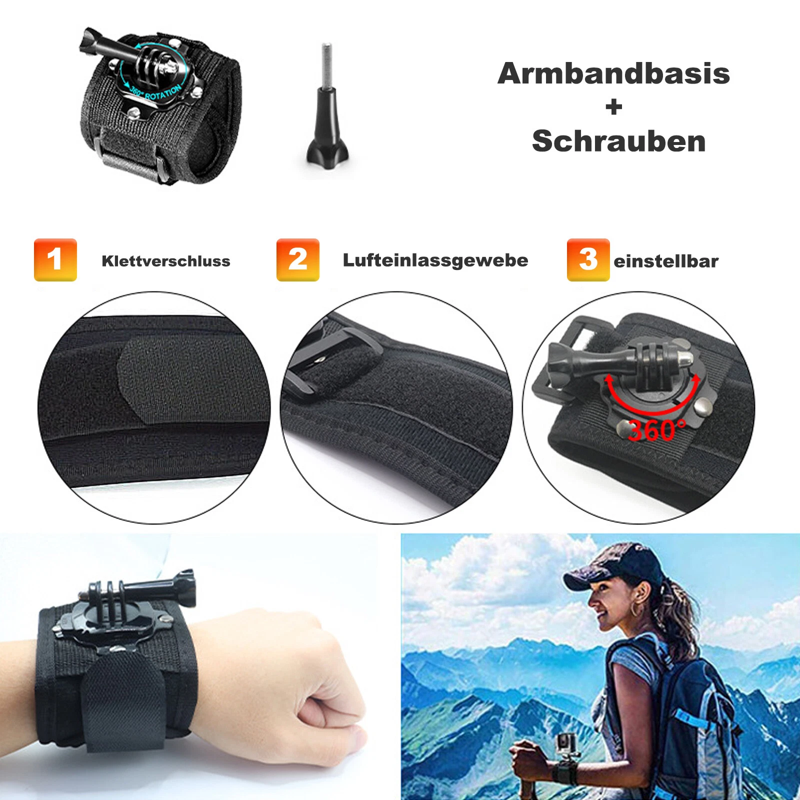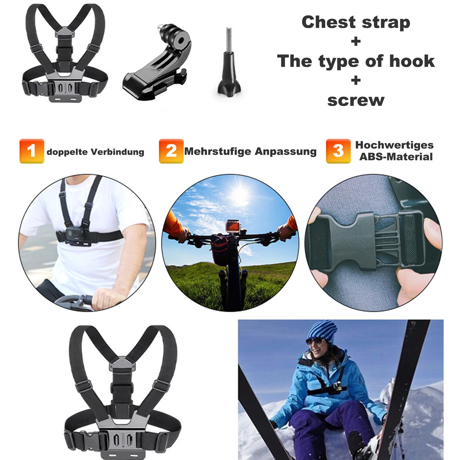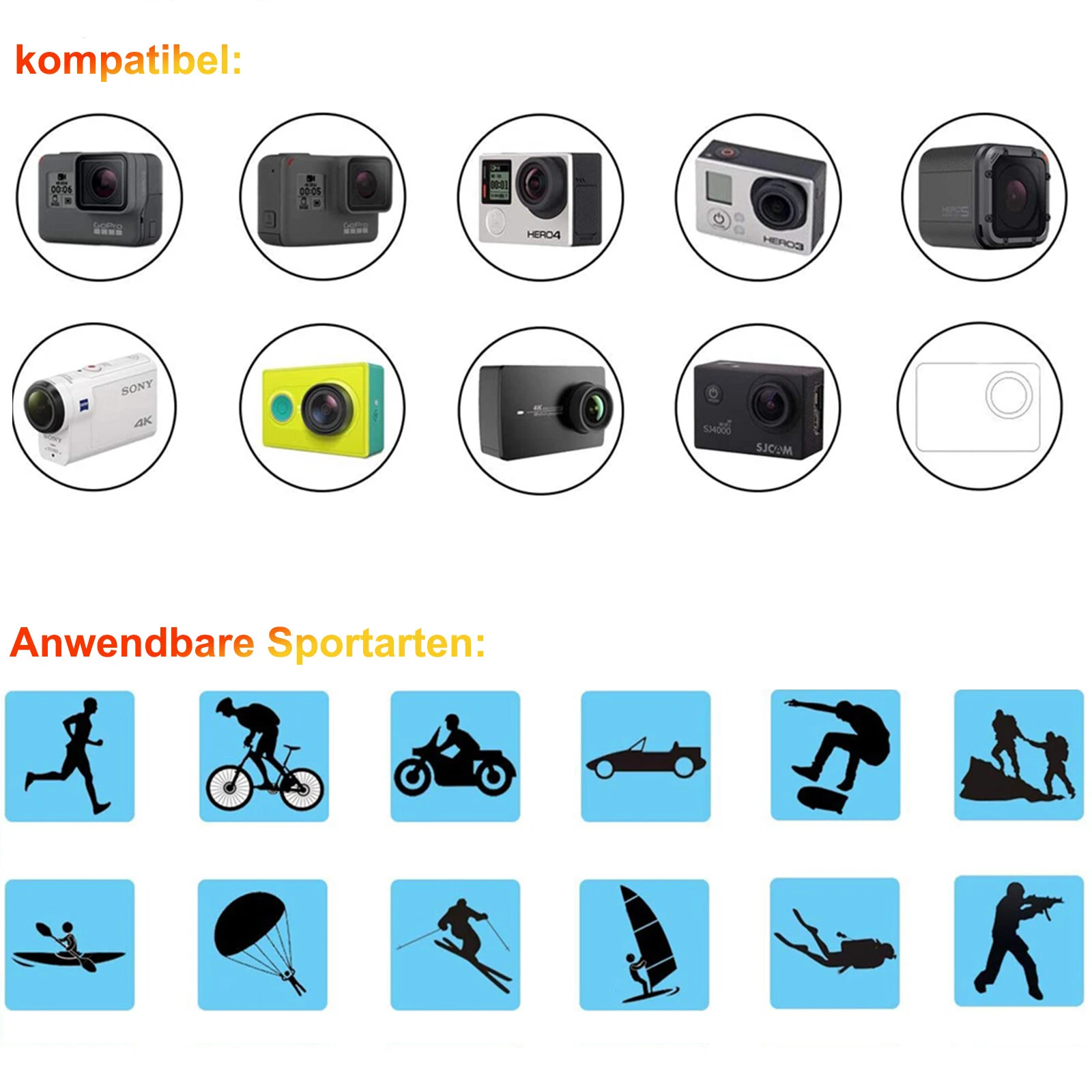 Mit einem zuverlässigen Zubehörpaket kann Ihre fotografische Reise sofort beginnen; Perfekte Halterung zum Laufen, Fahren, Klettern, Fallschirmspringen, Skifahren, Surfen, Kajakfahren, Radfahren, Motocross, Reiten und andere Action-Outdoor-Sportarten, um beeindruckende Video- und Fotoaufnahmen zu machen.