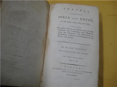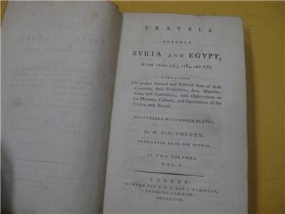 Travels through Syria and Egypt : in the years 1783, 1784, and 1785. Containing the present natural and political state of those countries, their Productions, Arts, Manufactures, and Commerce ; with Observations on the Manners, Customs, and Government of the Turks and Arabs. Illustrated with copper plates. By M. C-F. Volney. Translated from the French. In two volumes. ..