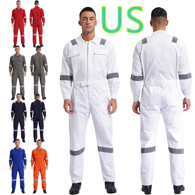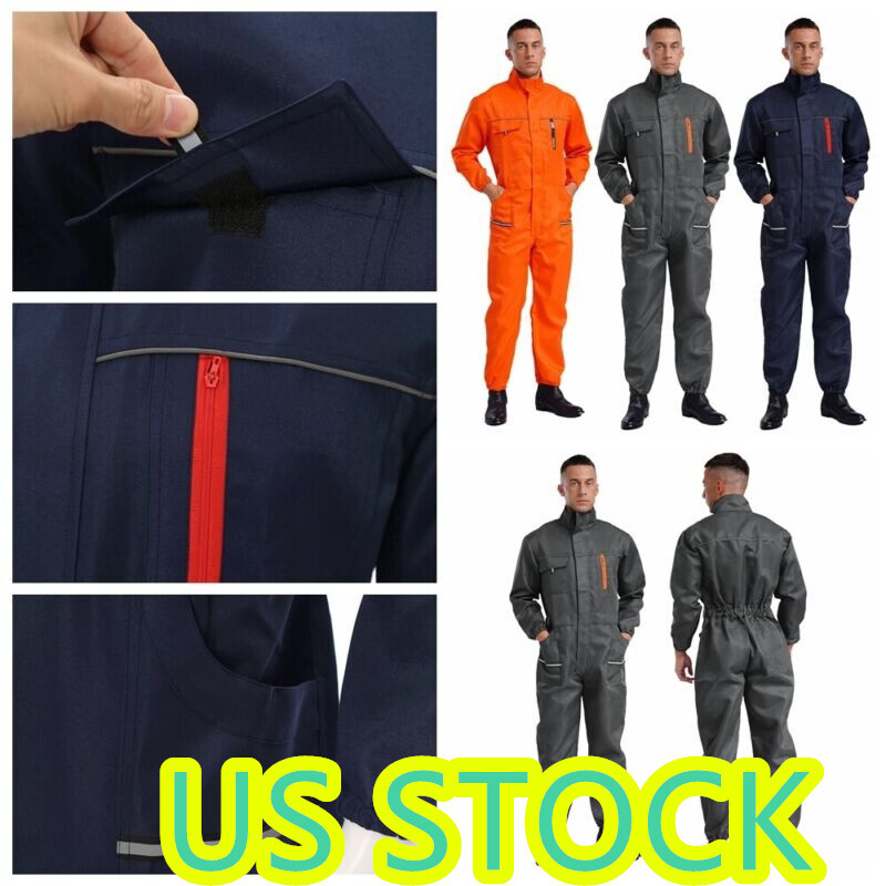 Unisex work jumpsuit fits for women and men, designs with stand collar, front zipper, elastic opening, multiple pockets, reflective stripes.