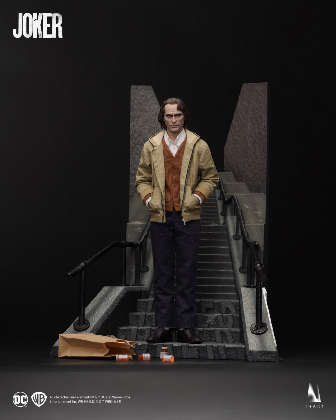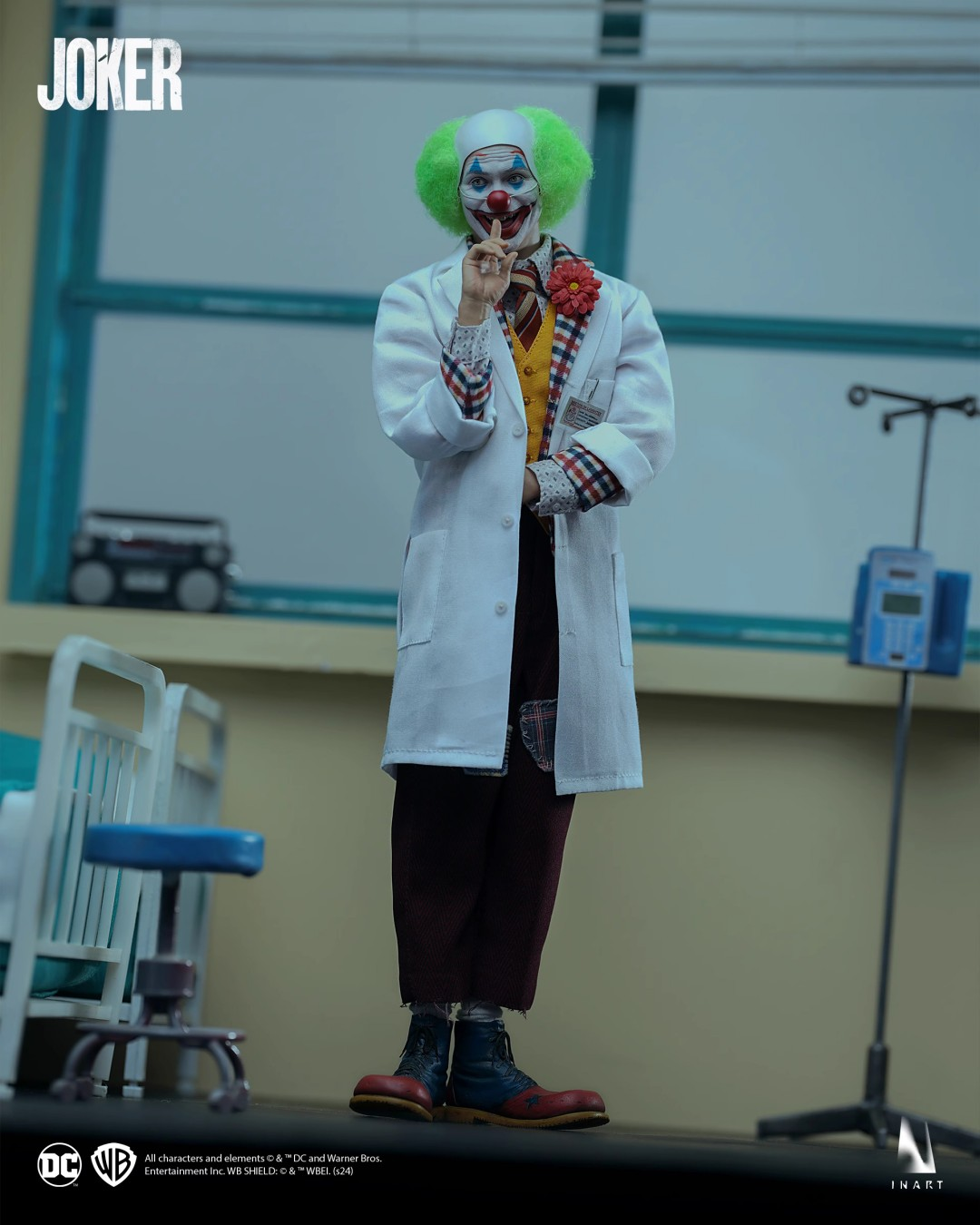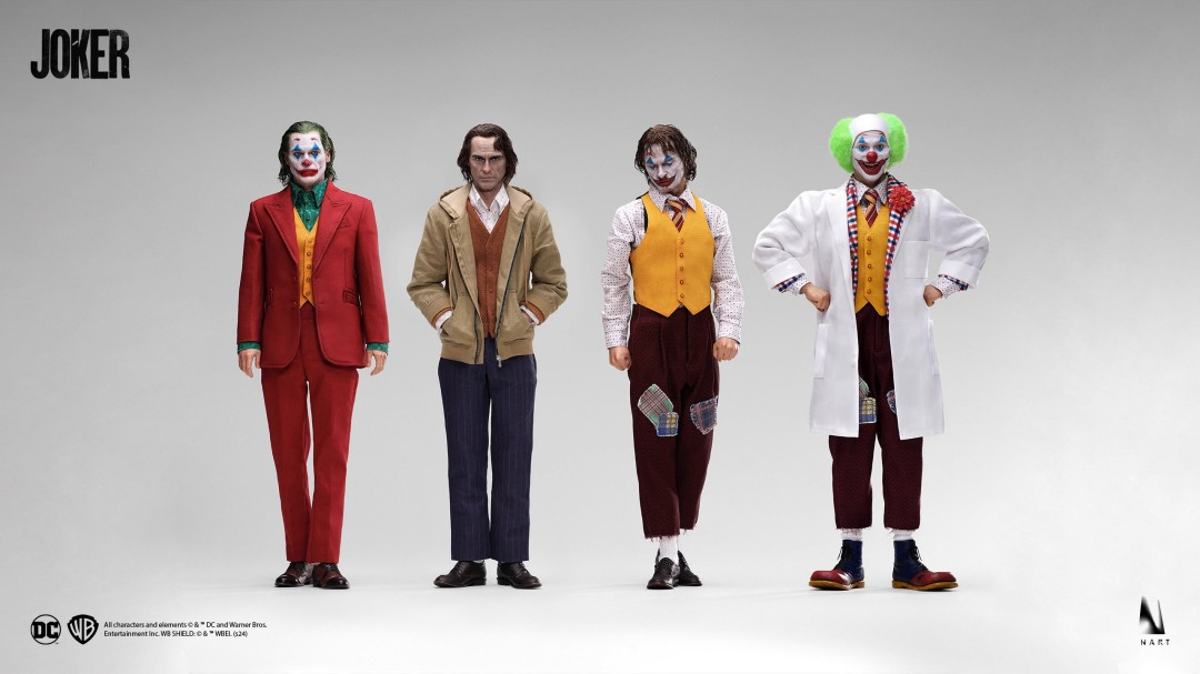 INART Articulated Body *4, Rooted Hair Bathroom Scene Head Sculpt *1, Rooted Hair Hospital Scene Head Sculpt With Rolling Eyes *1, Rooted Hair Arthur Fleck Head Sculpt With Rolling Eyes *1, Rooted Hair Joker Head Sculpt With Rolling Eyes *1, Hospital Gown Set *1, Yellow Vest Set *1, Red Suit Set *1, Casual Clothing Set *1, Relaxed Hands *2 Pairs, Open Hands *2 Pairs, Right Dancing Hand Pose *1, Right Smoking Hand *2, Right Bag Holding Hand *2, Left Gun Holding Hand *1, Right Pointing Hand *1, Fist Hands *1 Pair, Gripping Hand *1 Pair, Gloved Hands *1 Pair, Right Gripping Hand (Gloved) *1, Billboard Holding Hands (Gloved) *1 Pair, Joker Shoes *1 pair, Red-Brown Leather Shoes *1 pair, Dark Brown Leather Shoes *2 pair, Clown Derby Hat *1, ID Tag *1, Boutonnière *1, Plaid Bag*1, Rotating Chair *1, Cigarette *2 , Pistol *1, Rooted Hair Joker Mask *1, Pill Bottle *4, Laughing Condition Card *1, Diary *1, Billboard *1, Hand-held Mirror *1, Paper Bag *1, Photo *1, Marker Pen *1, Magician Flowe