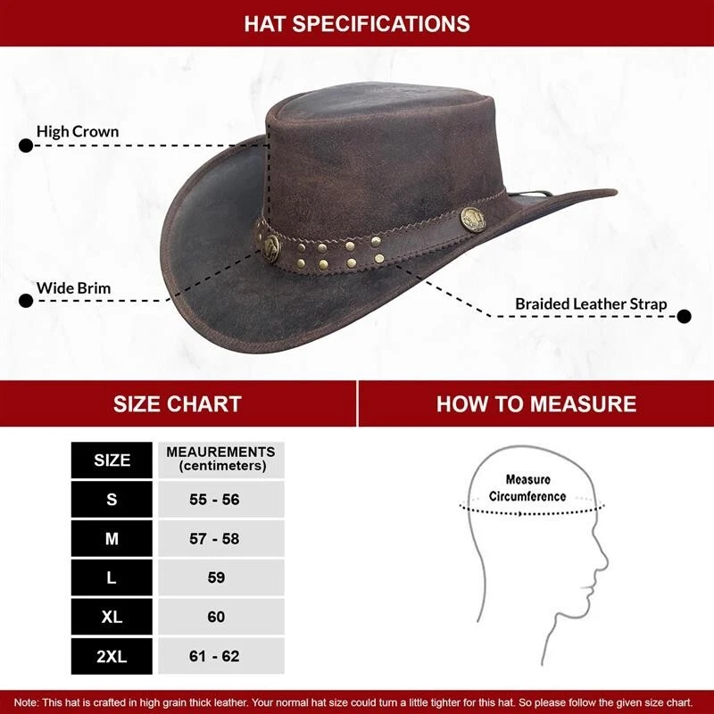 Hat's Leather Top Quality: Our Australian bush leather hat is exclusively made with the finest genuine leather and premium reinforced stitching. This handmade down-under Hat will give you the best level of durability and comfort. Produced to the highest standards of premium craftsmanship making our leather cowboy hats for men stand alone and lasting for decades.