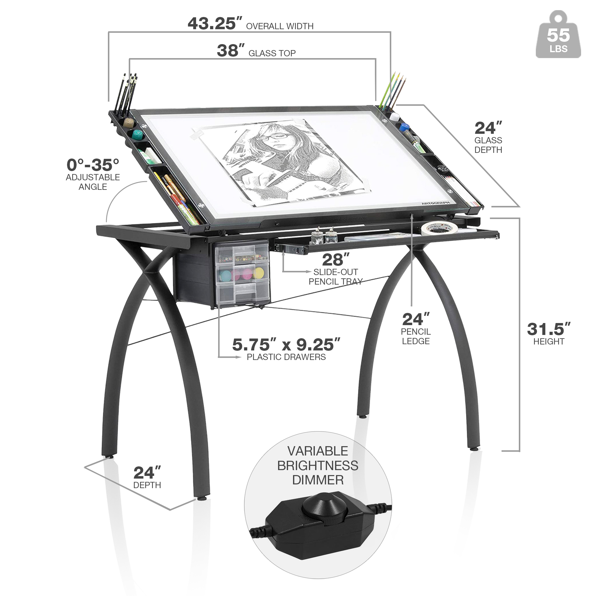 This desk is the perfect drafting or drawing station. The table has a 38-inch wide and 24-inch deep work surface made of durable, tempered safety glass. Meanwhile, you can adjust the worktop angle up to 35 degrees to suit your individual or project needs. This table also features 4 art trays, a large supply drawer, a sliding pencil ledge, and super bright, illuminating LEDs. Long story short, it has plenty of storage space. Featuring a variable brightness of 500 to 5,500 lumens, get the versatility your artwork requires and upgrade your home studio.