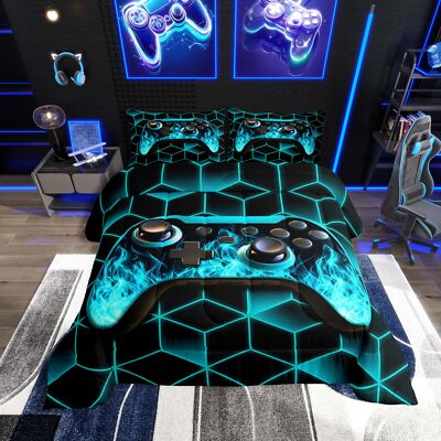 Teal Kids Bedding Sets for Boys Gamer Gifts,Neon Geometry Boys Twin Comforter Set,3D Geometric Boys Bedding Sets Twin Flame Game Consoles Gamer Decor for Boys Bedroom Decor