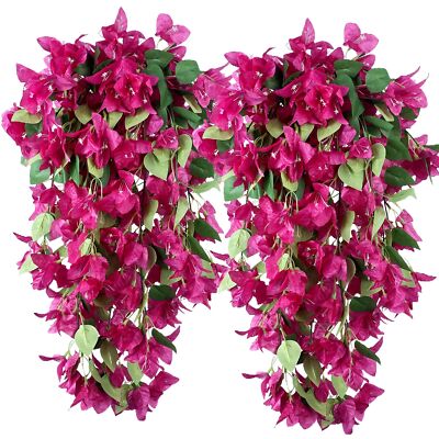 - SIZE & PACKAGE: artificial hanging flower total length measures about 28.35 inches. The bougainvillea hanging vines has 5 branches and 72 flowers + 48 green leaves. You will get 4pcs bougainvillea hanging flowers in the box and they can make full blooms on basket.