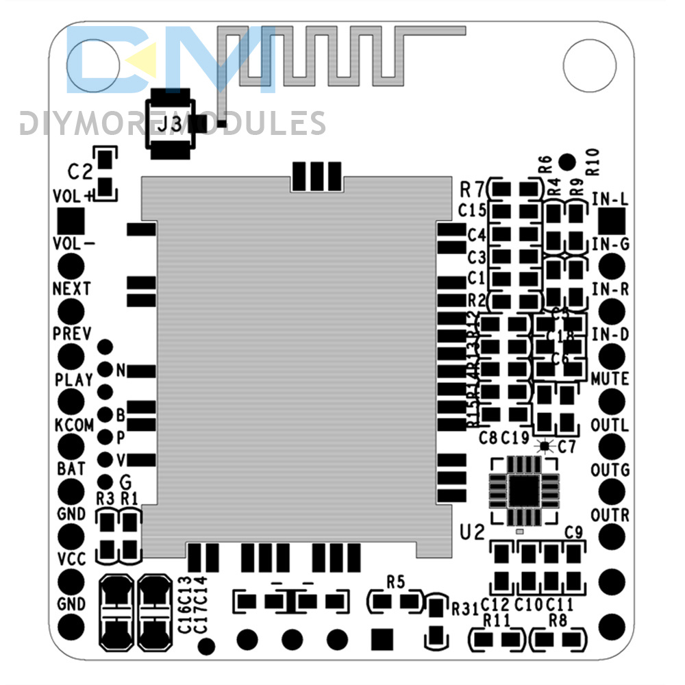 KCOM for the common end of the keys, the other end of the keys are connected to VOL+, VOL-, PREV, NEXT, PLAY, key line length of 5cm or less