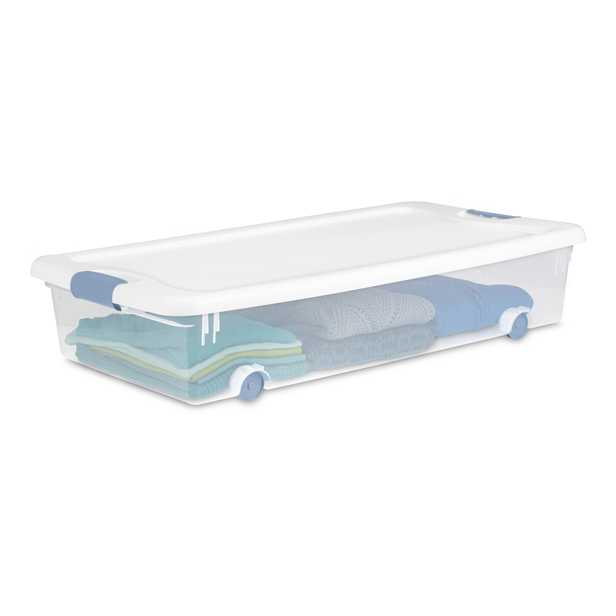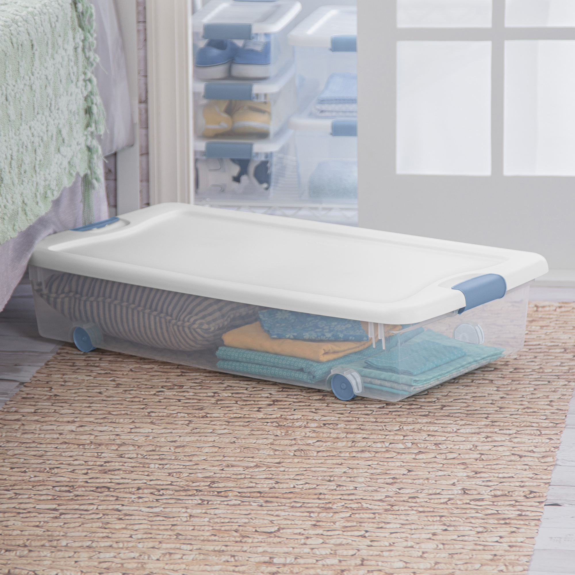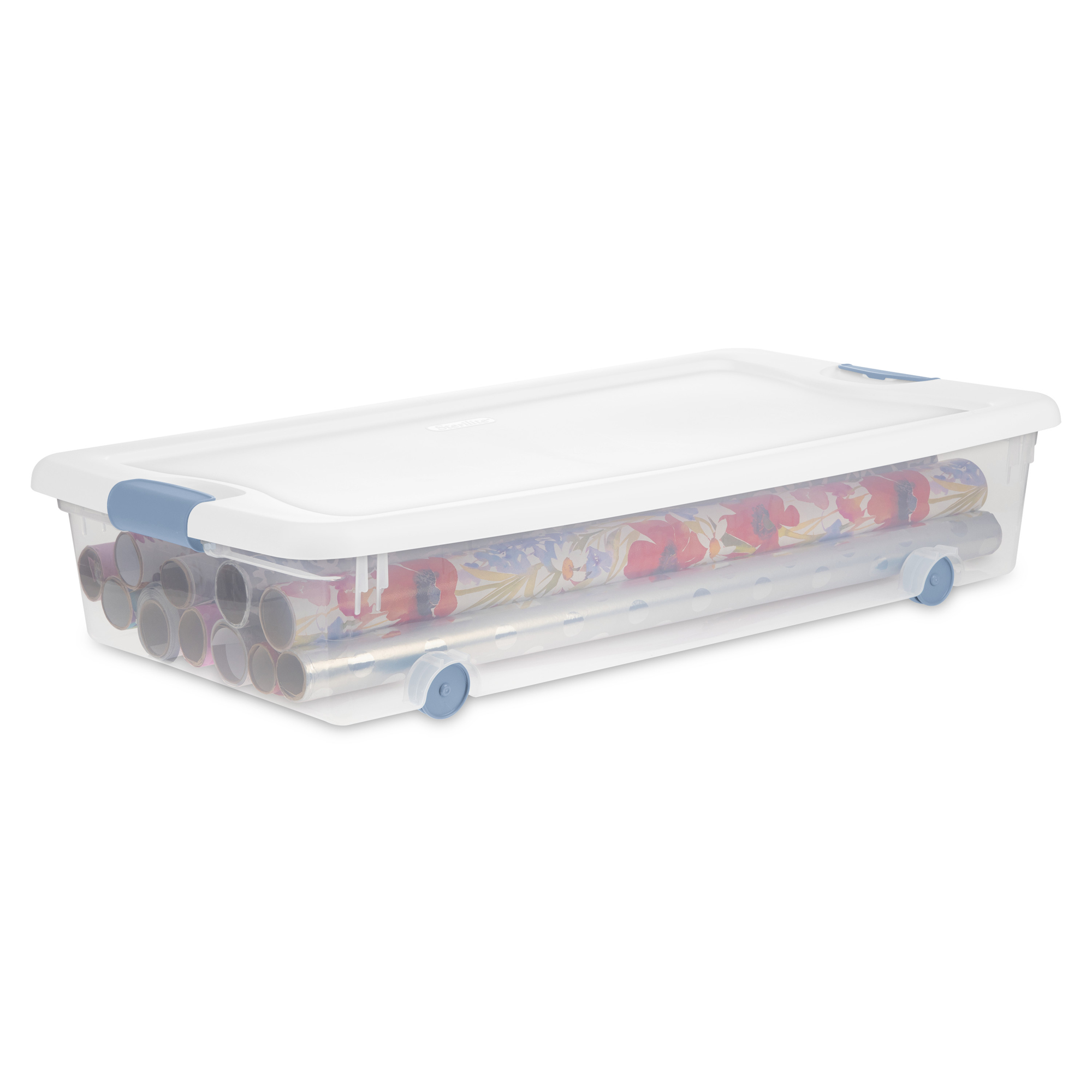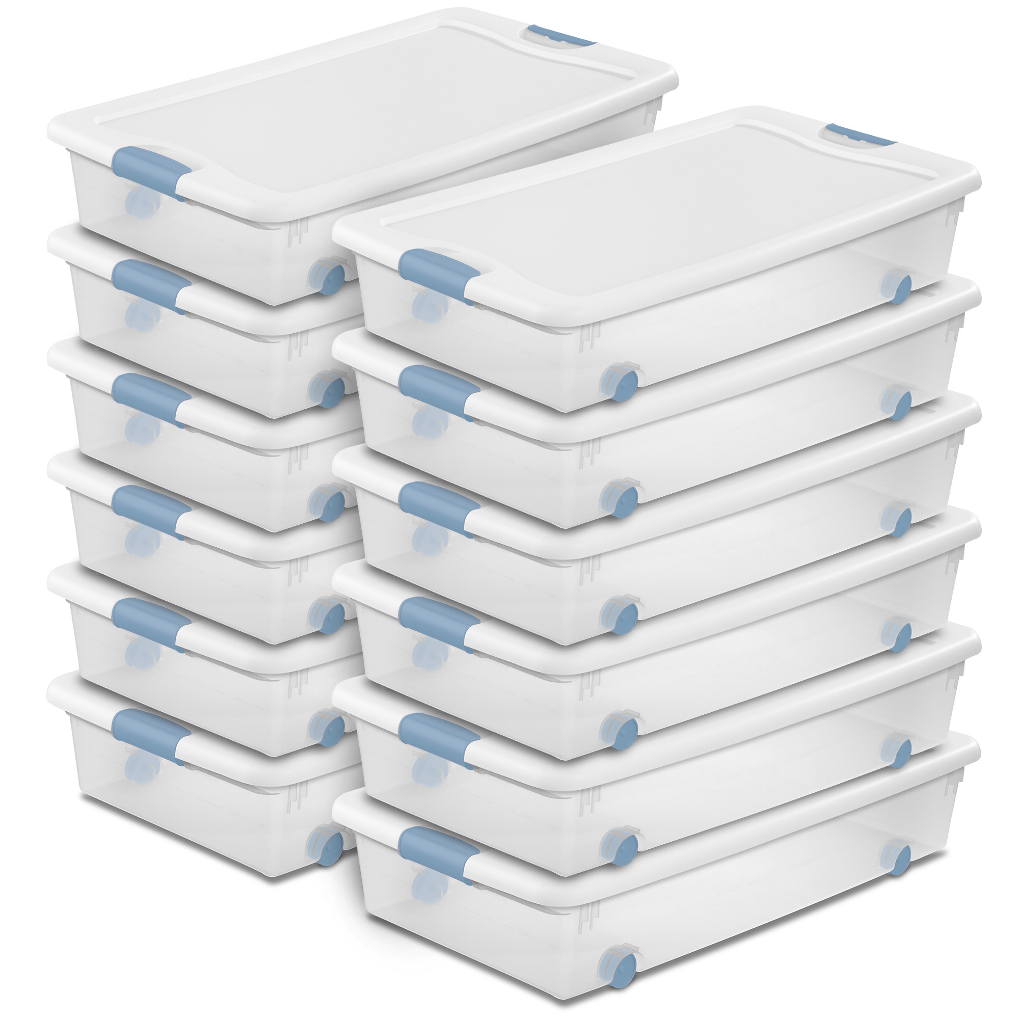Save space and keep items organized throughout the house in the 12 pack of Sterilite 56-Quart Latching Storage Container. These clear storage containers with wheels are the ideal storage solution for storing shoes, toys, crafts, clothing, winter hats, and other items.
