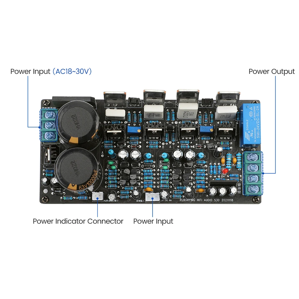2. It adopts a protection circuit composed of a relay and UPC1237, which has the function of switching machine and anti-impact, mid-point DC output protection, which can effectively protect the horn.