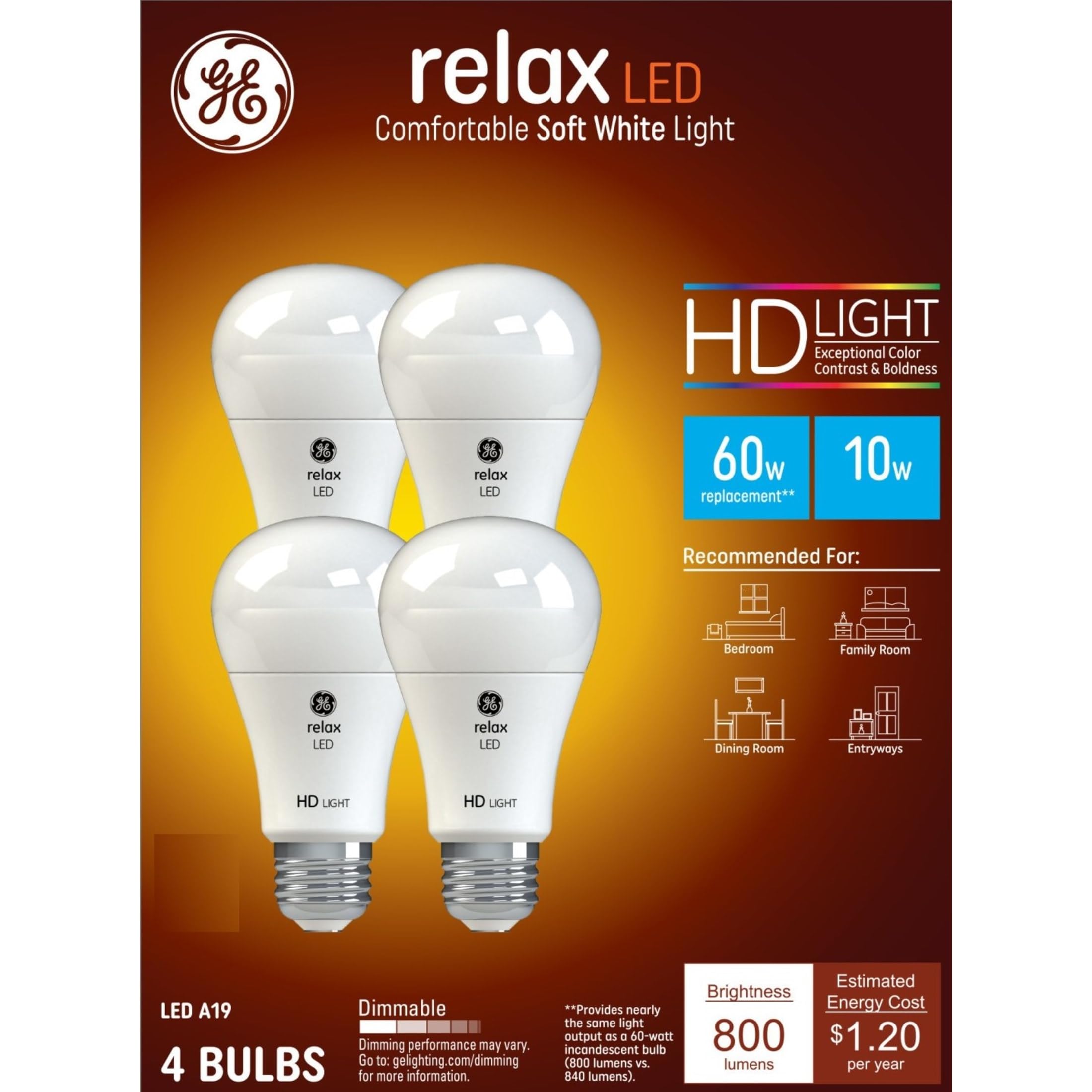 The Relax HD Soft White Light Bulbs are improved, energy-saving LED bulbs that enhance home décor and the appearance of colors. Experience the difference with bolder colors and enhanced contrast vs standard LED white light bulbs. Dim the lights and set the right mood for any occasion with these dimmable light bulbs. Our high-definition light bulbs offer a warm, soft white light that is perfect for comfortable moments and cozy spaces. We recommend these HD bulbs for use in spaces like bedrooms, family rooms, dining rooms, and entryways. These energy-efficient soft white bulbs replace 60-Watt bulbs and are rated to last up to 13.7 years based on 3 hours of daily use, saving you money for years to come.