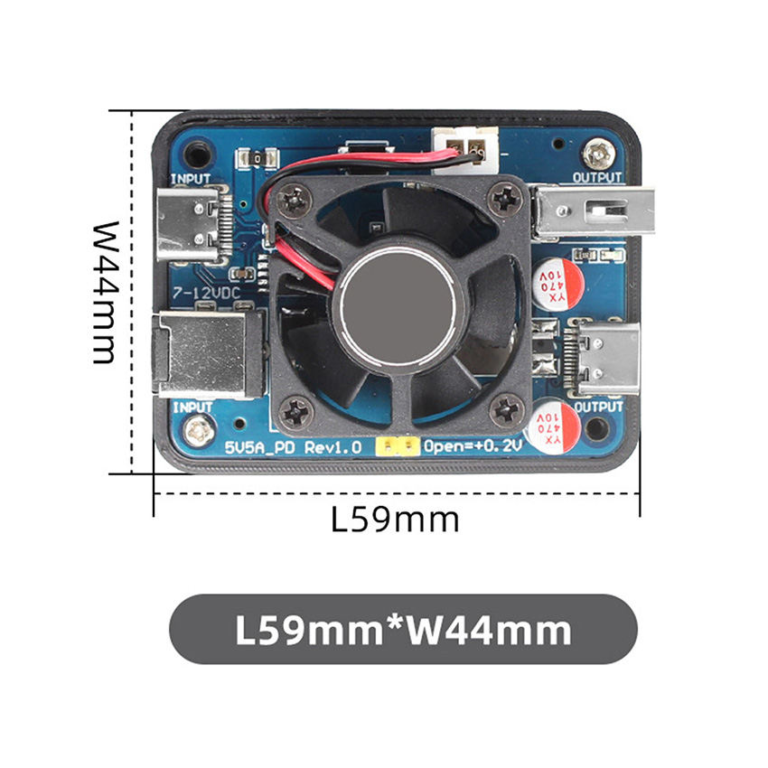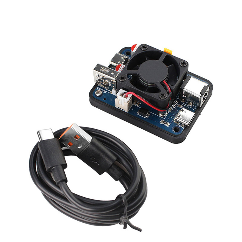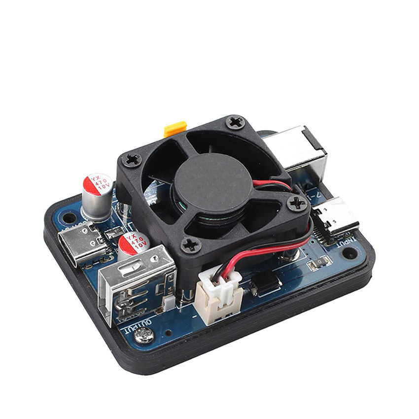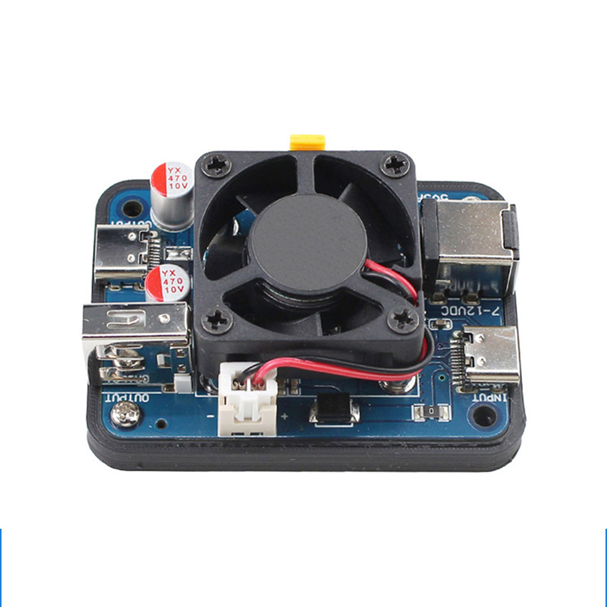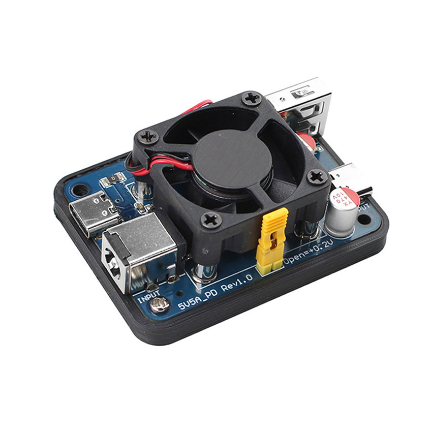 l As chip performance continues to improve, power consumption is also on the rise. The Raspberry Pi 5, released in October 2023, is recommended to be powered at 5V5A. For platforms like NVIDIA Jetson and USB3.0 high-expandability routers such as R4S, the demand for current is increasing. The minimum starting point is 5V3A, but it is recommended to use 5V4A or, conditions permitting, 5V5A. In response to such high-current applications, our company has designed a new generation of 5V5A (short-term reaching nearly 5V6A) power module. Compared to earlier versions, the new design comes standard with a fan, ensuring stable and reliable operation under sustained high-current loads. It also adds support for PD chargers