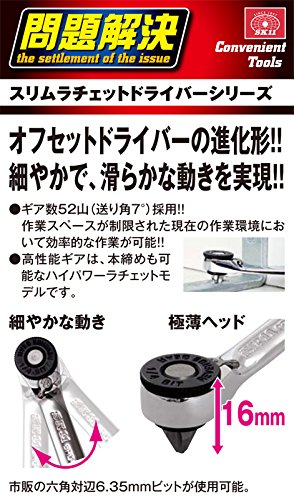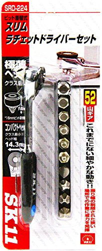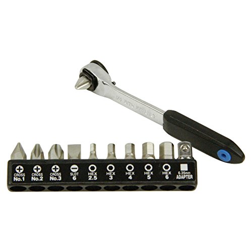 Set contents: Slim ratchet driver, 16mm single-headed bit + No.2, 19mm single-headed bit +No.1, +No.2, +No.3, -6mm, H2.5, H3, H4, H5, H6, 6.35sq. socket adapter bit