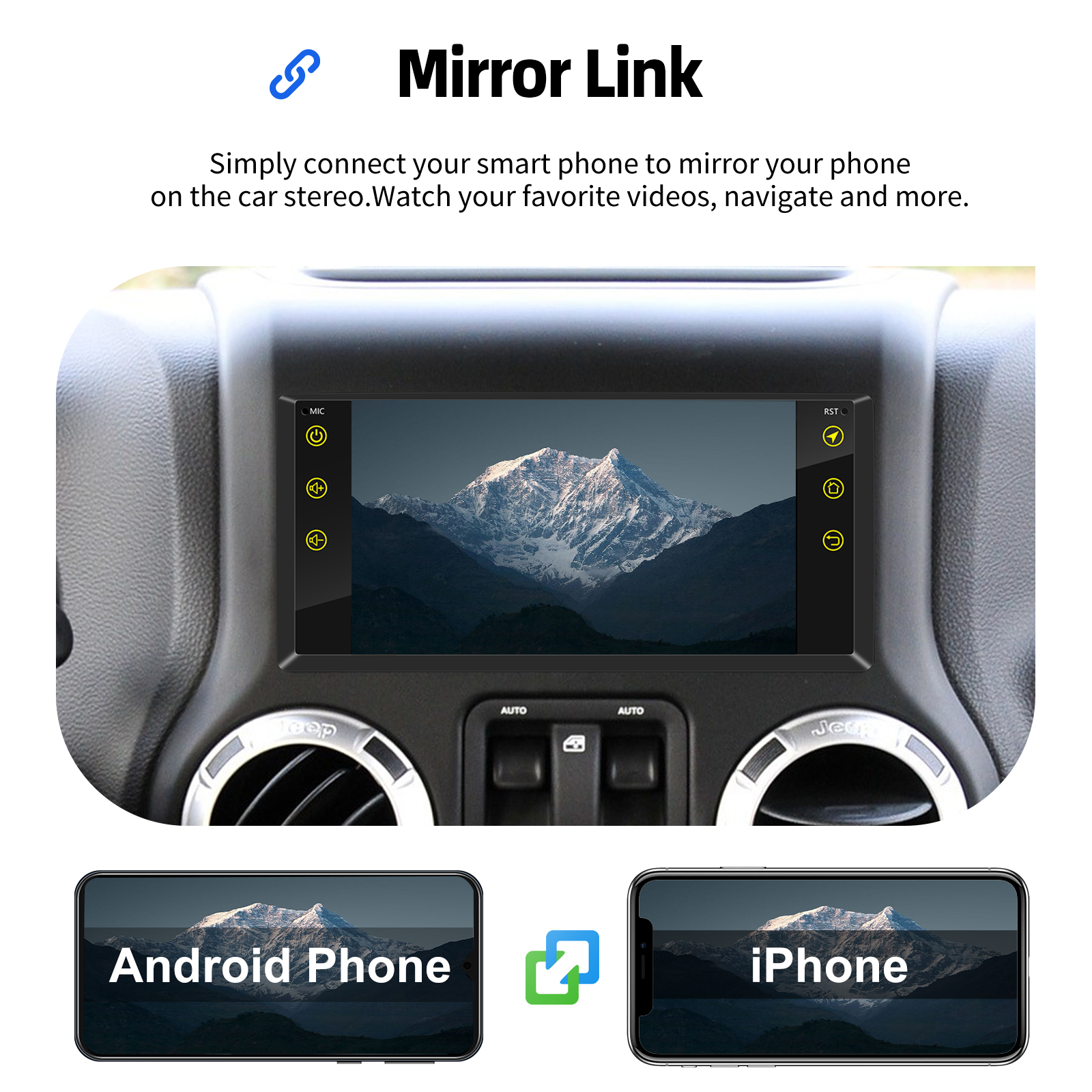 Mirror Link: With this car radio, you will experience the impressive Mirror Link function, compatible with iOS and Android phones. You can mirror your smartphone screen to the car radio using apps like Google Maps, Spotify, Youtube, etc. Replace your mobile phone with the car screen and turn your vehicle into a smart platform.