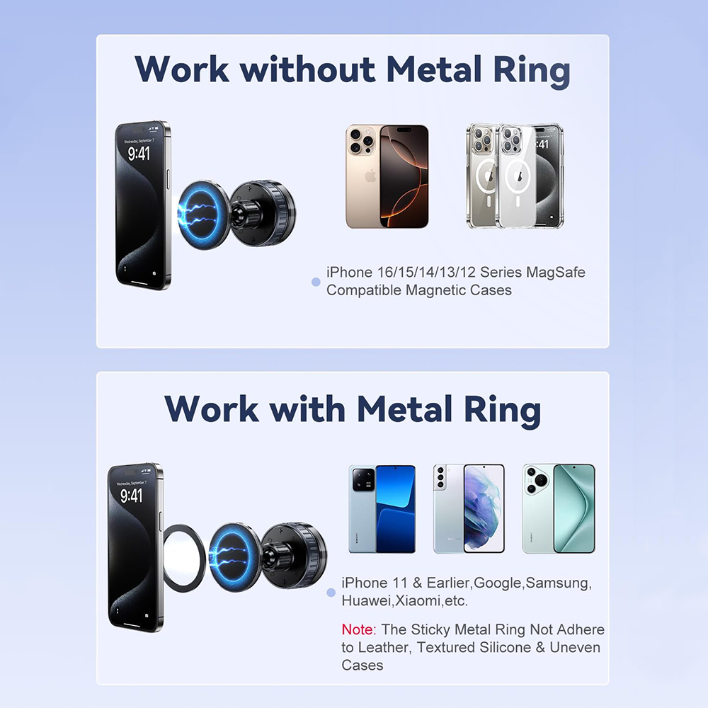 - 【Warm Tips】1.The metal ring included in the box should be stick to outside of phone or case for suction if device without magnet; 2.No wireless charging; 3.Please turn the knob on the base to the tightest setting for an enhanced product experience; 4.Surface should be smooth and dry.
