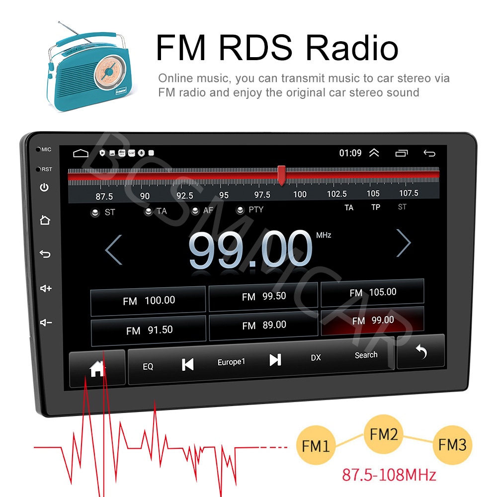 ●FM Radio: Online music you can transfer the music to the car stereo by FM to enjoy the original car stereo sound,with 18 preset stations