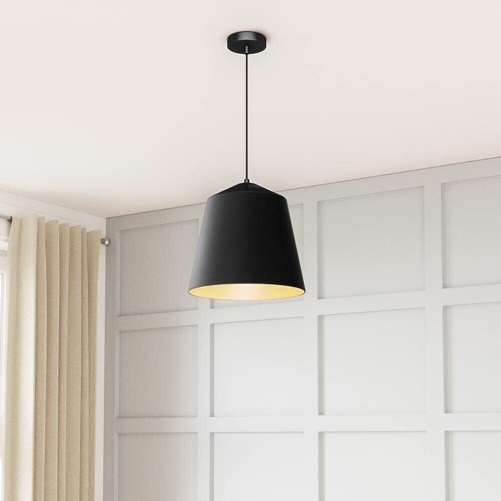 Create a modern look for your space by installing this 1-Light Black Metal Industrial Farmhouse Hanging Kitchen Pendant Light. It works well over a kitchen island, in a dining room or other spaces around your home. It features a classic black finish that easily pairs with a variety of design schemes.