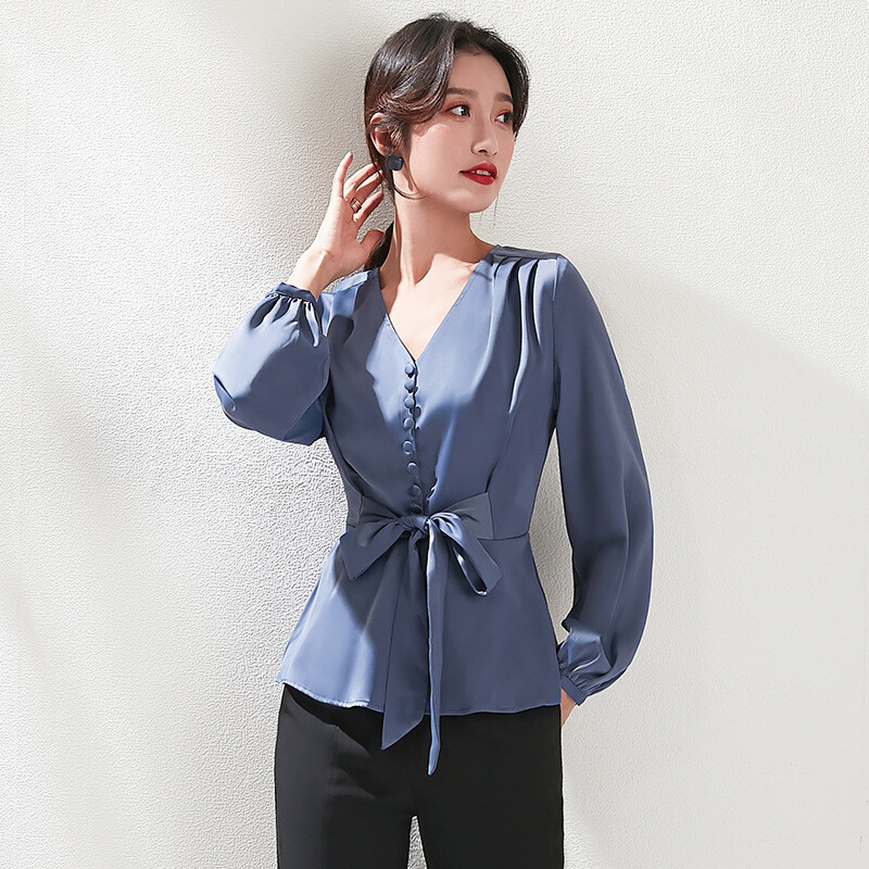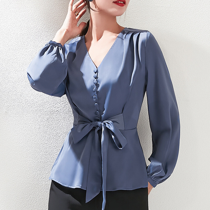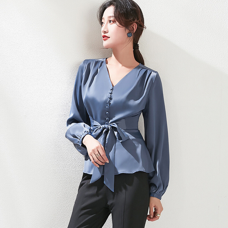 Womens Fashion Satin V Neck Belt Slim Fit Shirts Casual Solid Color Blouse Tops
