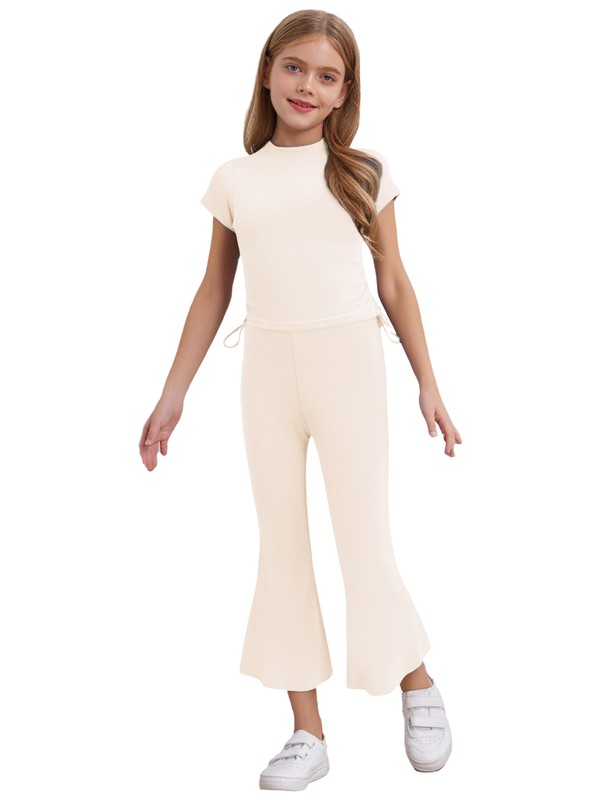 Girl’s 2-piece cute outfits include short sleeve drawstring T-shirt and elastic waistband flared pants.