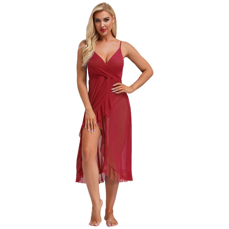 Deep v neck, adjustable spaghetti straps, sleeveless, high waist, calf length sheer nightdress for women.