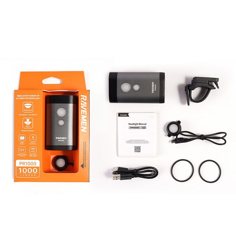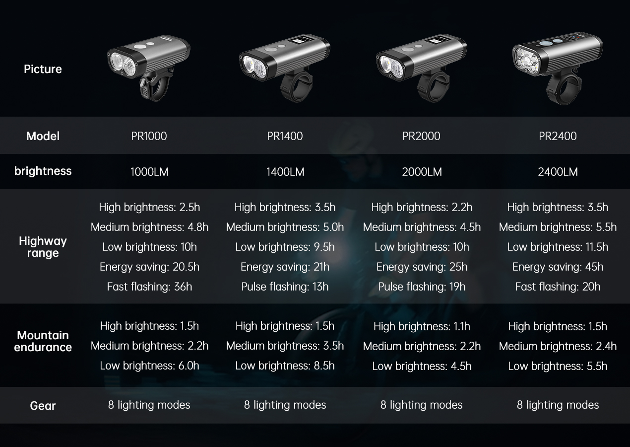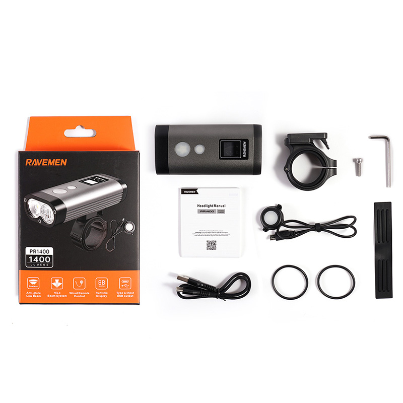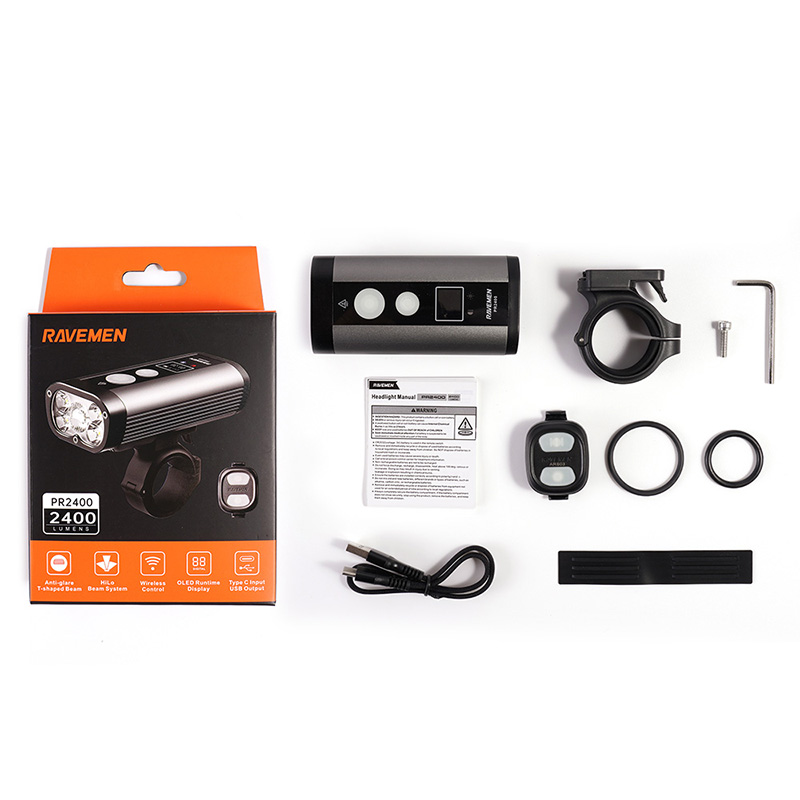 Product features1.Anti-blend optical lens for road bike mode to reduce glare for other road users and near-wide flood light and wide-distance spot light for urban driving2.HiLo Beam System for Mountain Bike Mode A simulation to design with wide and wide dipped beam for all off-road rides3.real-time display only For PR2400 to display the remaining runtime of each brightness level 4.Radio remote switch with instant maximum output and brightness adjustment buttons foreasy control of the PR24005. Extending battery life with external power source6.Type-C input port for easy charging and USB output port for charging your portabledigital devices7.Intelligent memory circuit remembers last used brightness level and mode when turned on again8.Intelligent thermal management circuit to prevent overheating 9.Quick release design for easy entry and exit and compatible with 31.8mm and 35mmRound handlebars