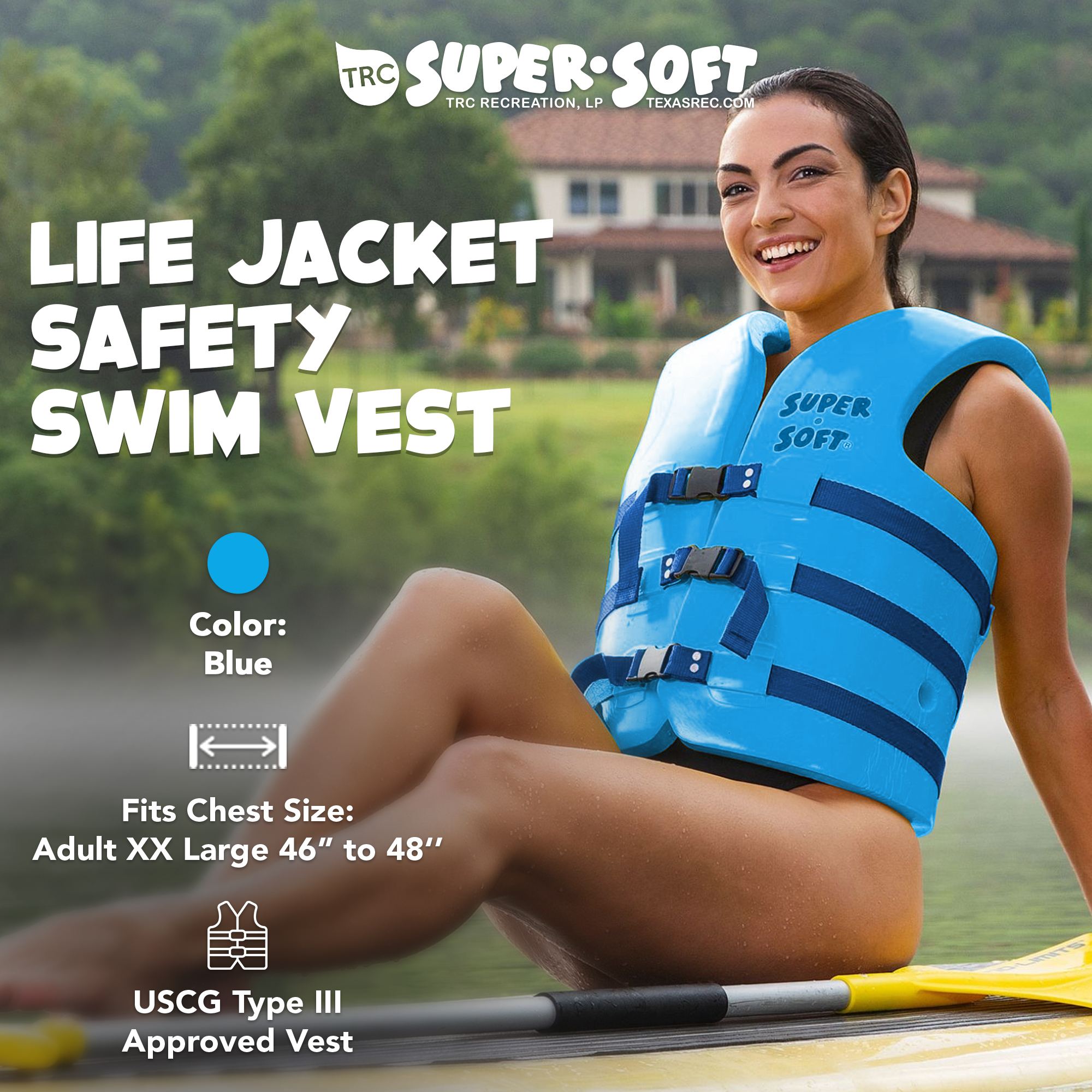 This flotation belt for adults is crafted in the USA and fits chest sizes 46 to 48 inches around. Stay secure and sound while swimming with the TRC Recreation Super Soft USCG-Approved Adult Life Vest. This meticulously crafted watersport vest prioritizes your security, ensuring a snug and secure fit for adult sizes. Whether swimming, boating, or engaging in water sports, trust this USCG-approved life vest to keep you safe and sound, allowing you to enjoy your aquatic pursuits with confidence and peace of mind.
