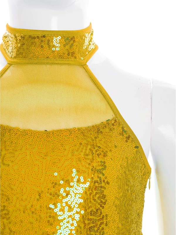 Sleeveless backless jumpsuit with sparky sequins and sheer mesh patchwork design makes your child stand out from the show.