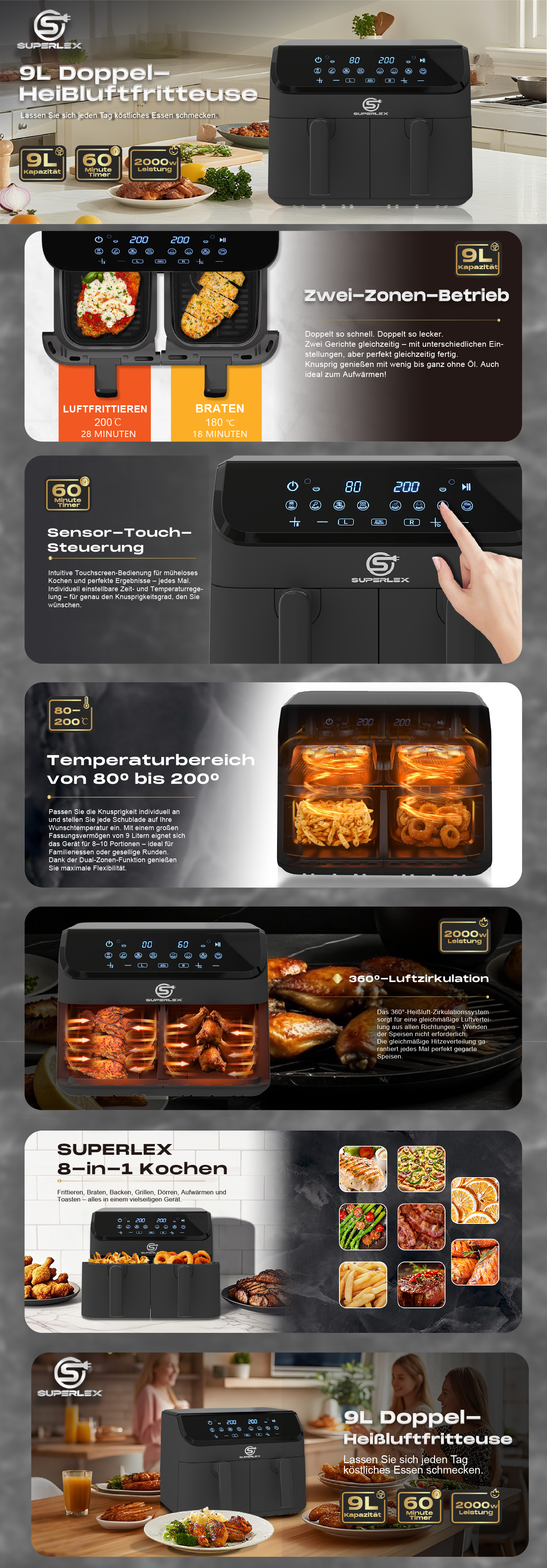 9 l Fassungsvermögen (4,5 l und 4,5 l): Die Heißluftfritteuse bietet problemlos Platz für 8–10 Personen und ist somit ein Muss für jede Party. Mit einem Fassungsvermögen von jeweils bis zu 4,5 Litern können Sie je nach Wunsch einzeln oder zusammen kochen.