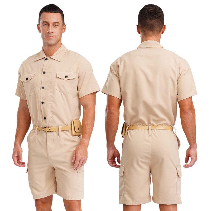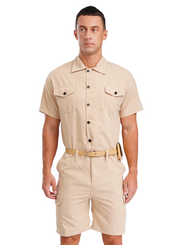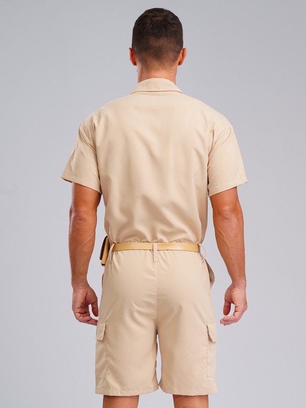 Designed with lapel, short sleeve, front button-up, multi-pocket, shorts bottom and solid color; matched with waist belt and purse.
