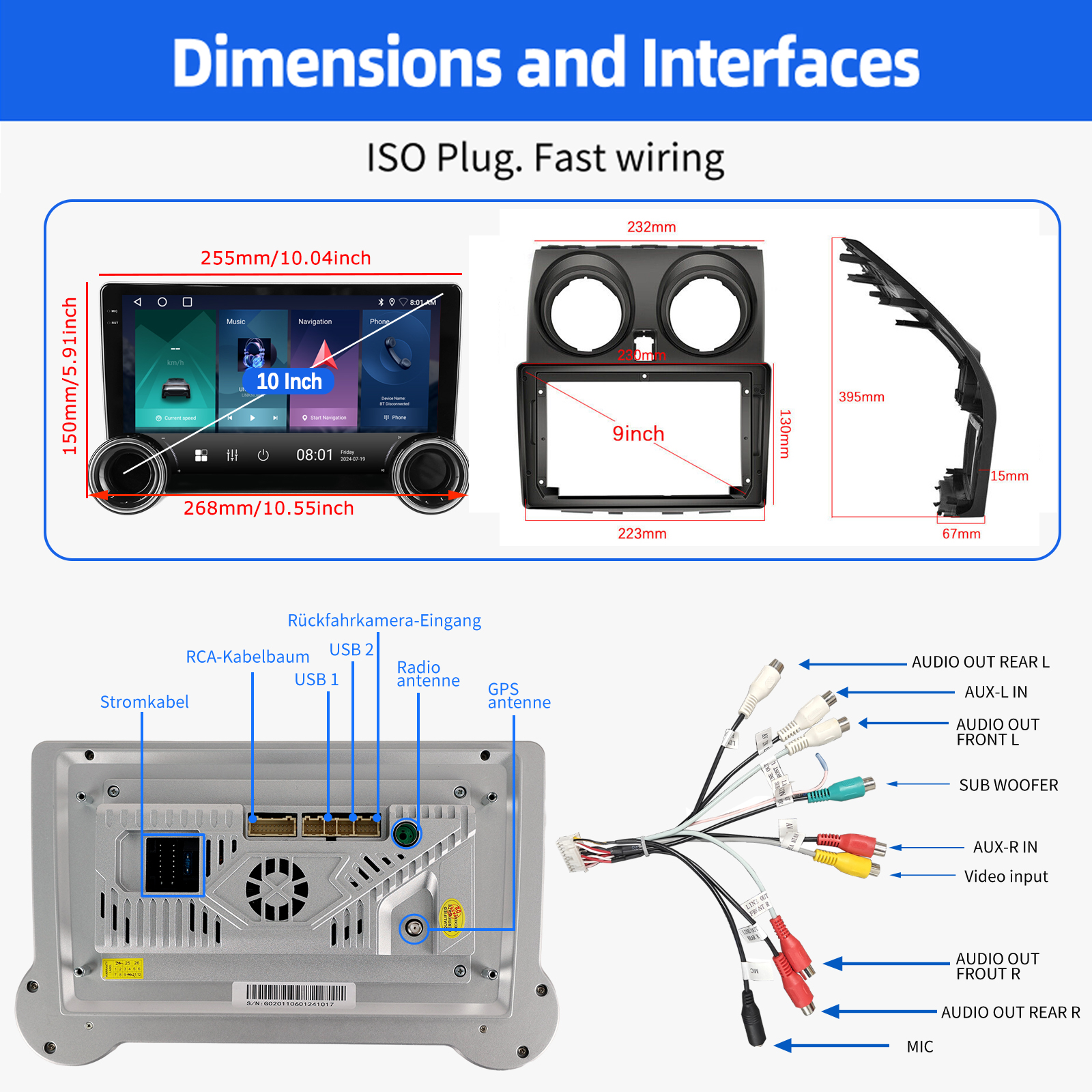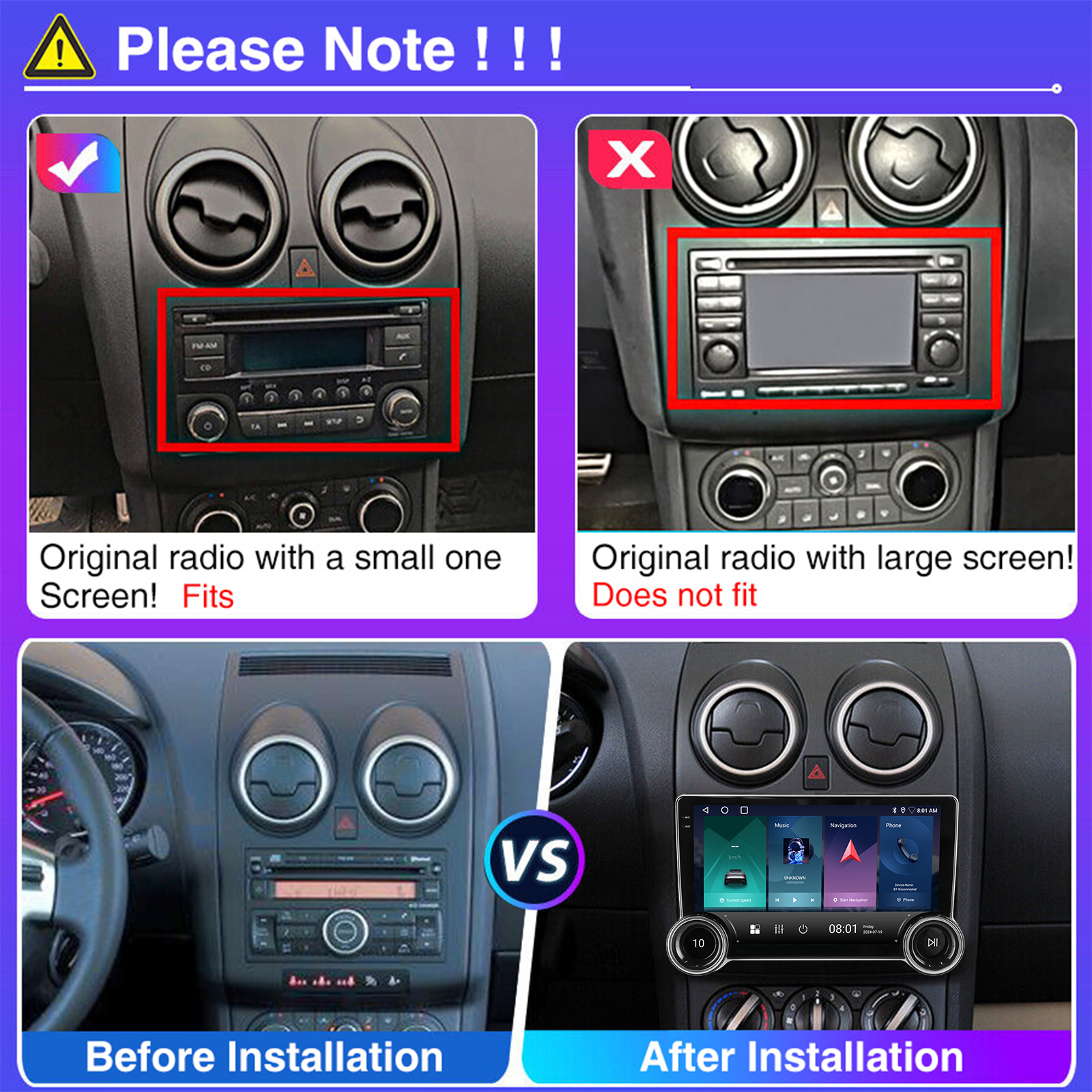 10.1 Inch Android 14 Car Radio For Nissan Rogue (2007-2013): The Android car radio with 10.1" 1280*720 2.5D IPS capacitive touch screen, 4GB RAM and 64GB ROM allows you to download your favorite apps and videos, so that driving will never be boring .No additional frame, no cable change, plug and play.