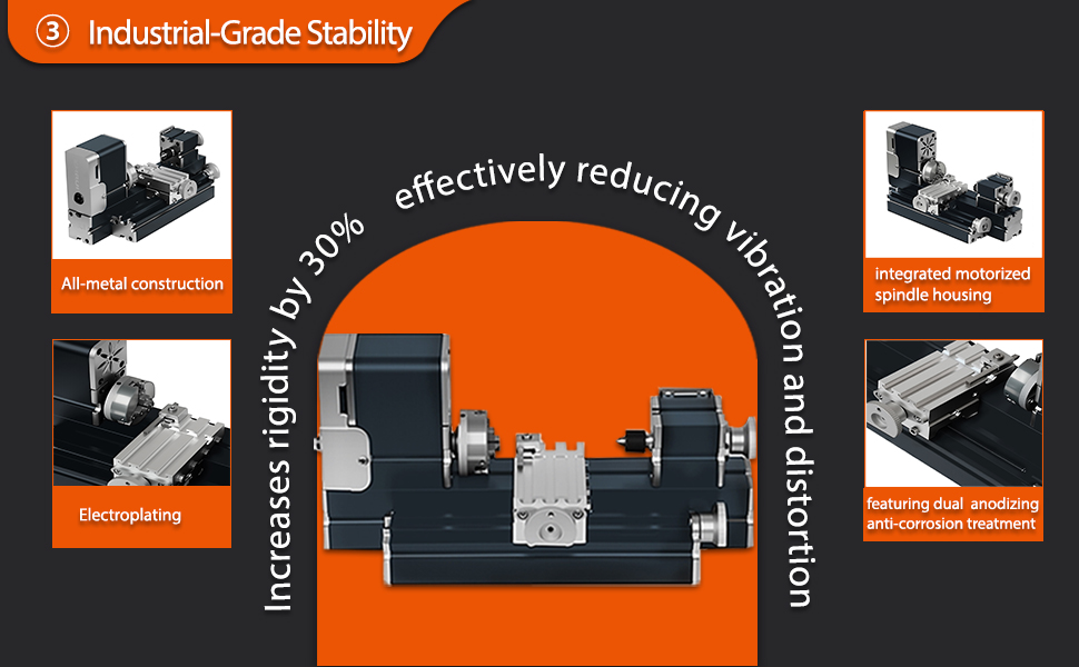 1.The motor case and headstock of all-metal machine tools is jointed completely. Main parts configure with metal structure and no plastic components in the whole machine body, such as motor box, headstock, hand wheels, slider, 3-jaw chunk/4-jaw chunk, turning tools clamping jaw, machine bed, gear, side cover, working table, connection piece, tailstock, countershaft, drive belt cover etc.