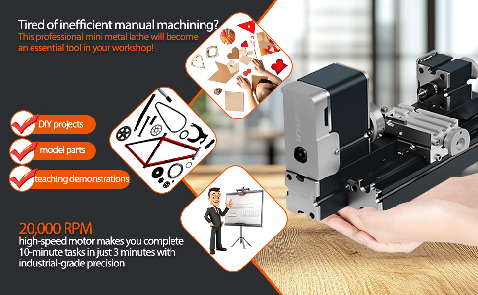 A:The miniature machine tools have the same features as big industrial machines, the only differences are their size and the 12V drive. You can use it for DIY model making and some little crafts, which is also able to process hard wood, soft metal, alloy etc...Based on its modularity and the child friendly use, that's ideal&creative product to inspire children hand-on skill &innovative ability.